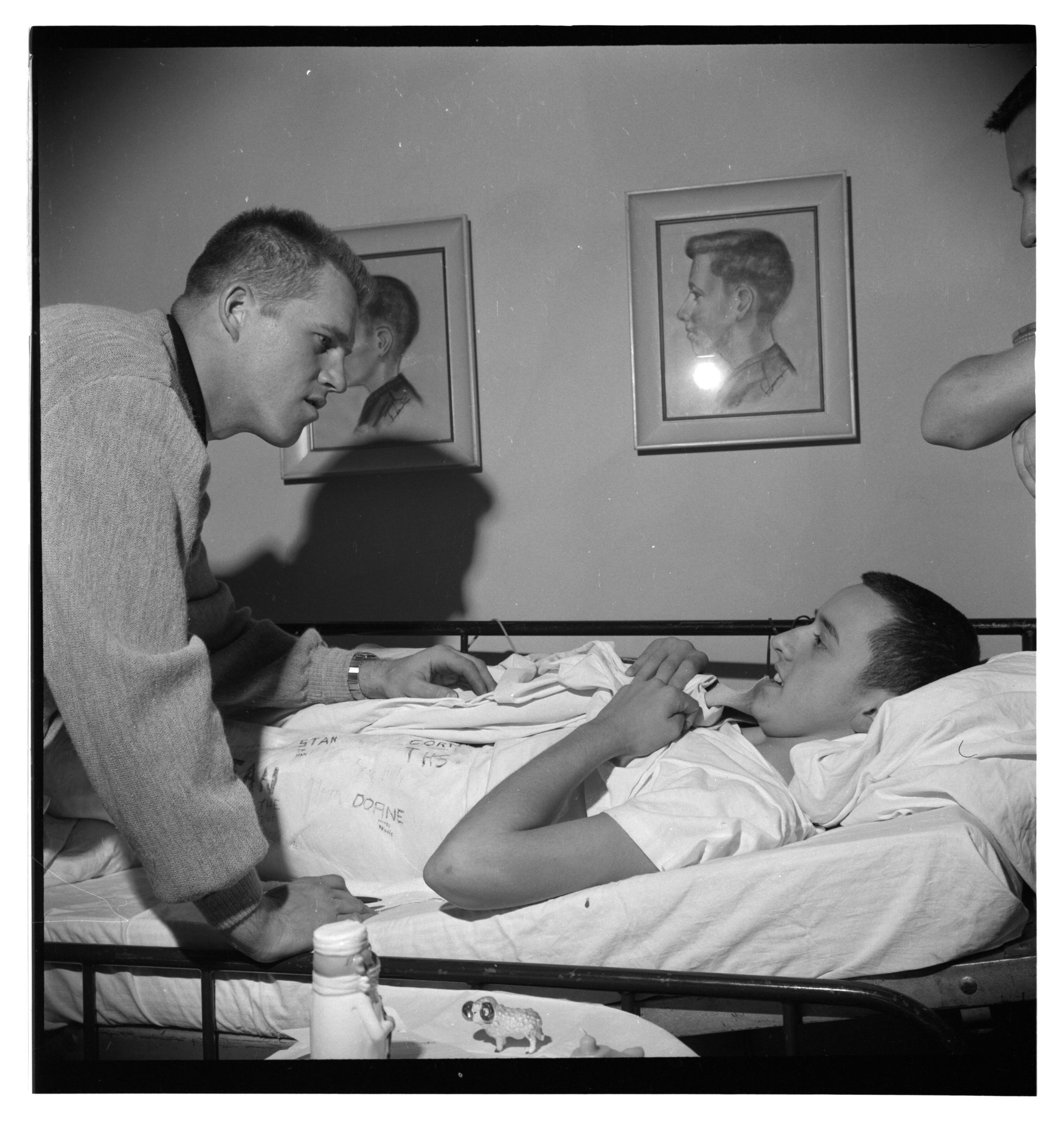 Negative, sheet film. 2 x 2 b&w. No. 827. OB Corp TV. Tony Kubek (NY Yankees' shortstop) and his wife visit some sort of nursing facility (in Olympia?)