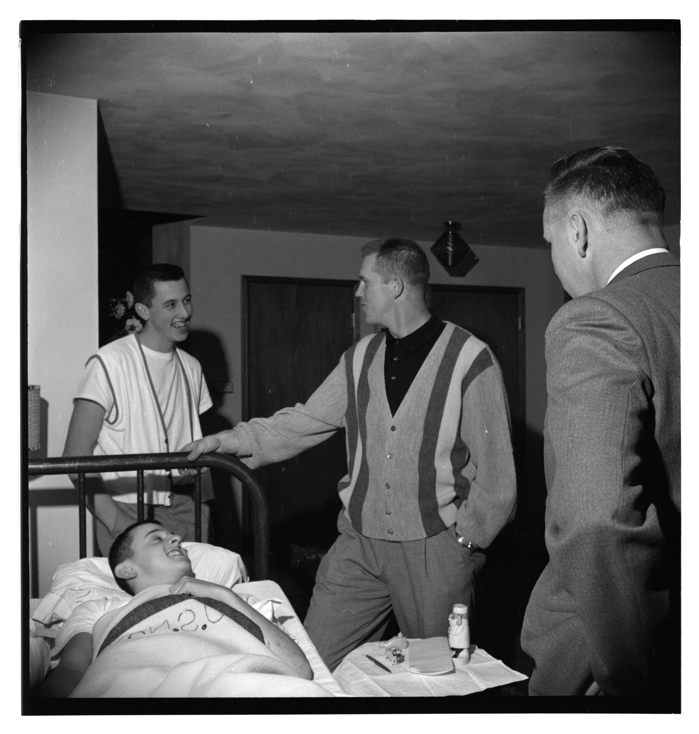 Negative, sheet film. 2 x 2 b&w. No. 827. OB Corp TV. Tony Kubek (NY Yankees' shortstop) and his wife visit some sort of nursing facility (in Olympia?)