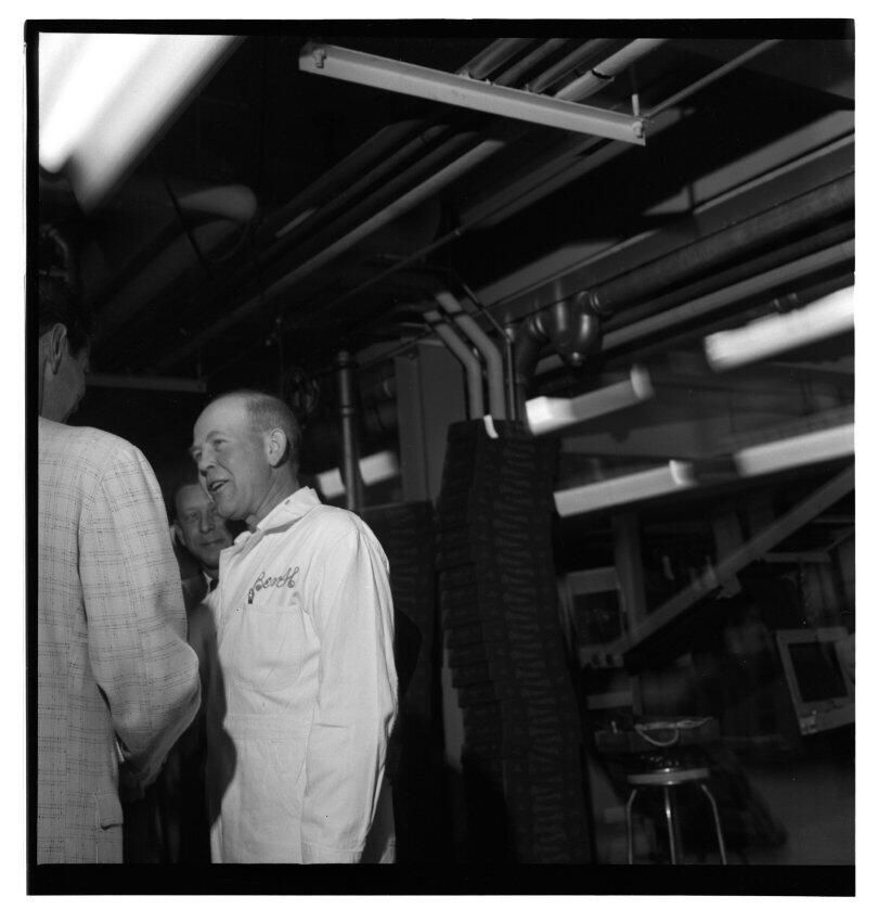Negative, sheet film. 2 x 2 b&w. No. 725. OB Corp TV. Actor Colin Male tours Olympia brewery. Ben Hazlitt on right.