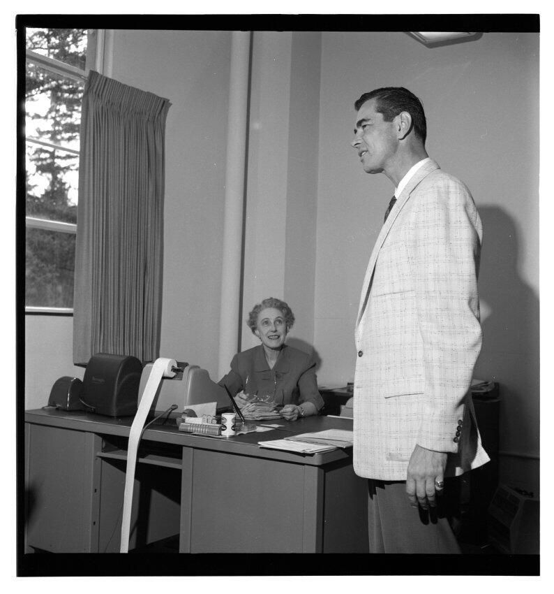 Negative, sheet film. 2 x 2 b&w. No. 725. OB Corp TV. Actor Colin Male tours Olympia brewery. OBC employee Helen Kimball seated.