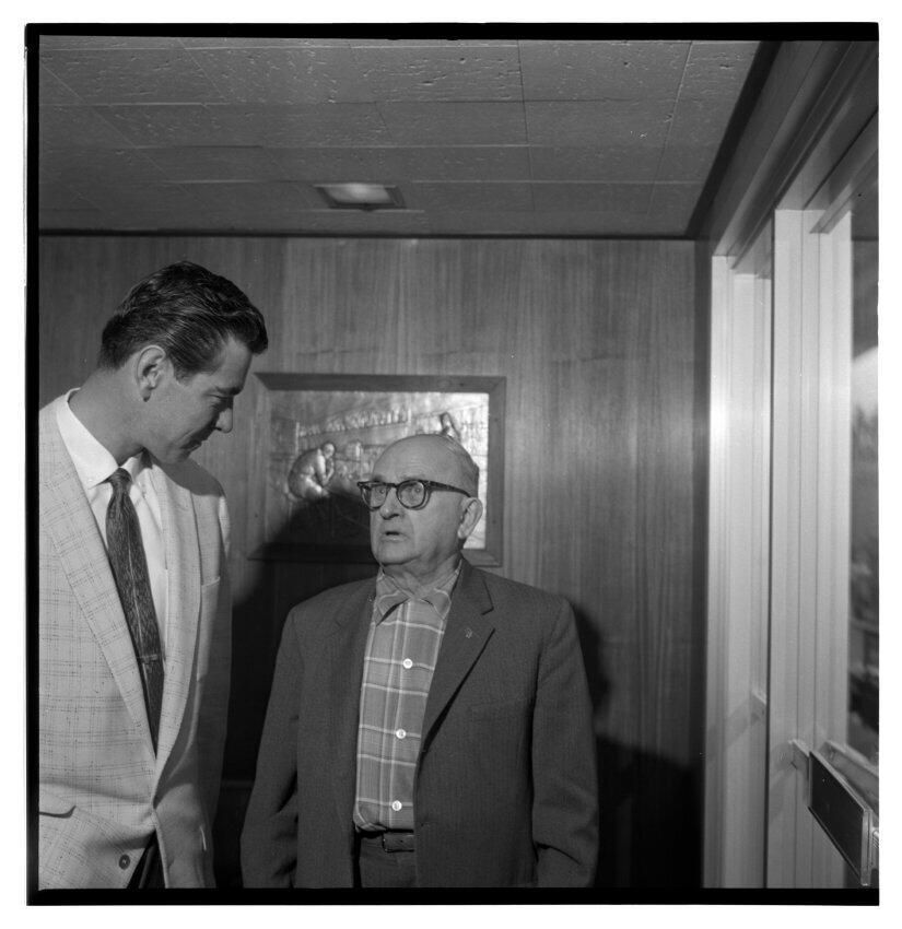 Negative, sheet film. 2 x 2 b&w. No. 725. OB Corp TV. Actor Colin Male tours Olympia brewery. No ID on other.