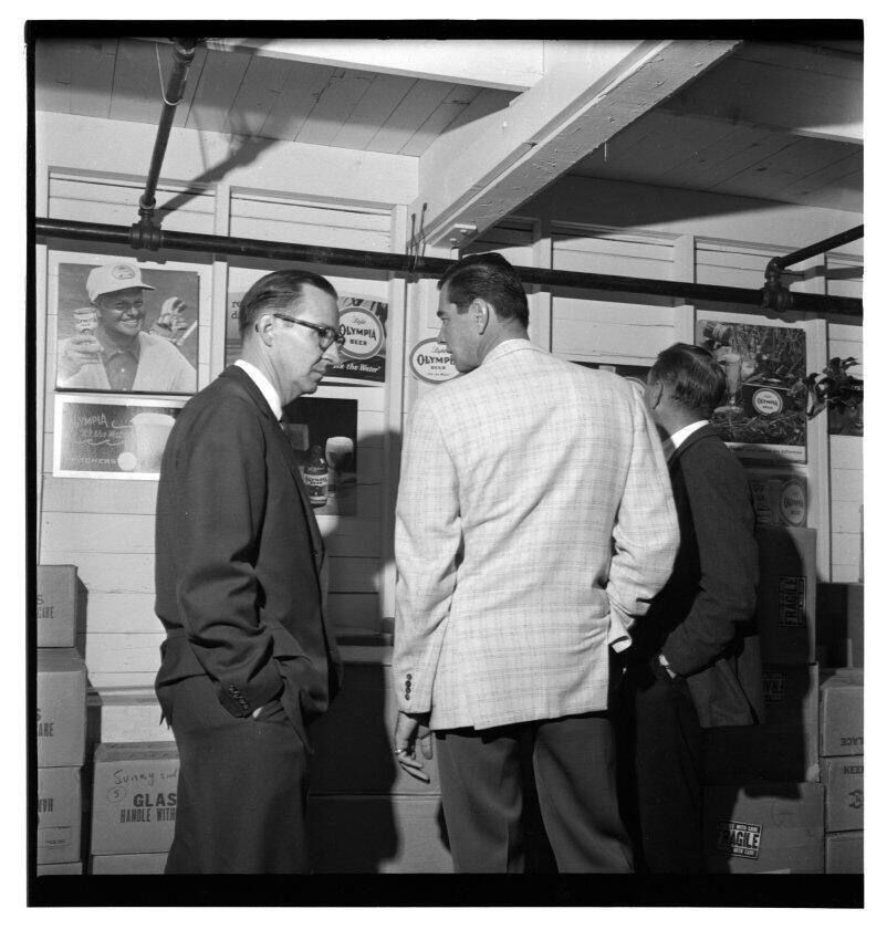 Negative, sheet film. 2 x 2 b&w. No. 725. OB Corp TV. Actor Colin Male tours Olympia brewery. Bobby Schmidt at left.