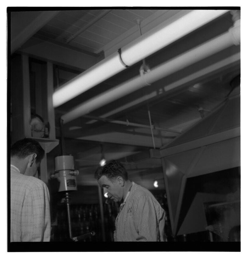 Negative, sheet film. 2 x 2 b&w. No. 725. OB Corp TV. Actor Colin Male tours Olympia brewery. No ID on other.