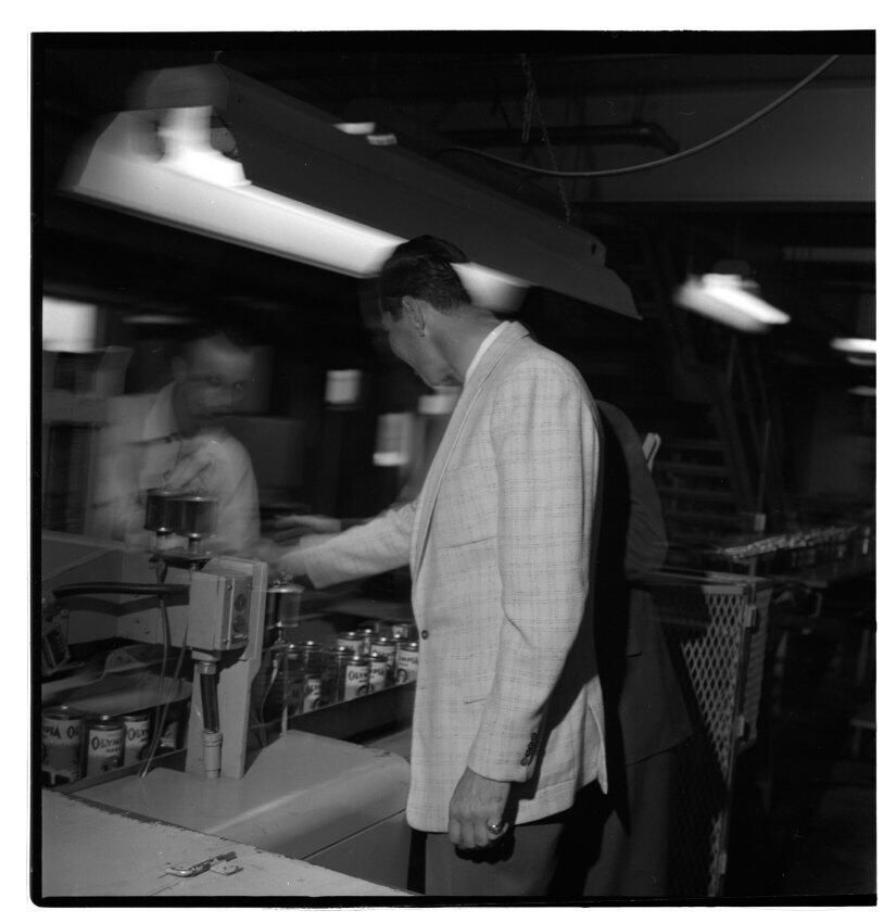 Negative, sheet film. 2 x 2 b&w. No. 725. OB Corp TV. Actor Colin Male tours Olympia brewery. No ID on others.
