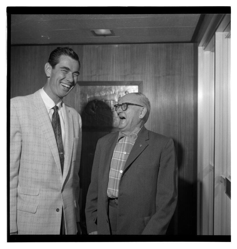 Negative, sheet film. 2 x 2 b&w. No. 725. OB Corp TV. Actor Colin Male tours Olympia brewery. No ID on other