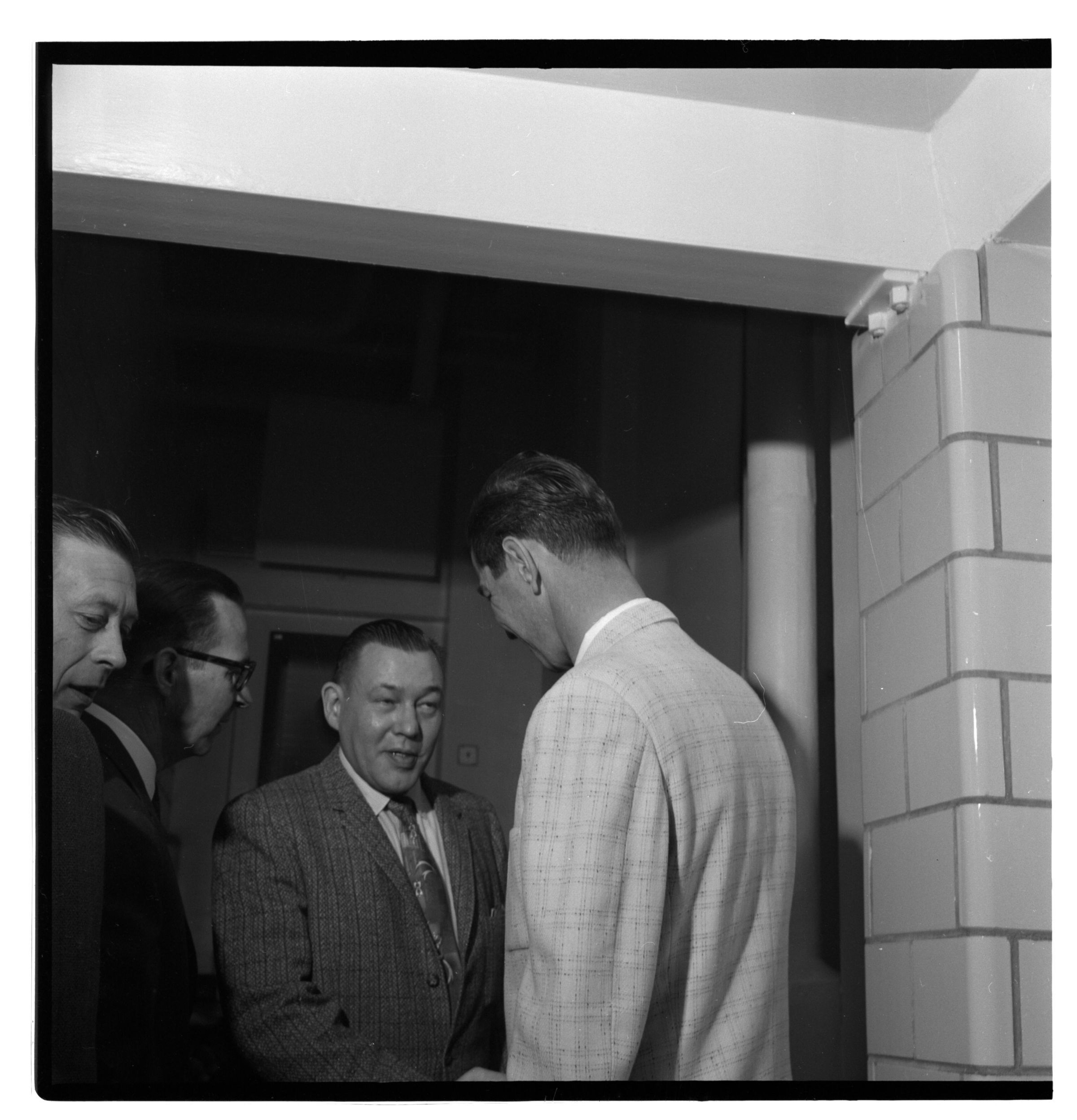 Negative, sheet film. 2 x 2 b&w. No. 725. OB Corp TV. Actor Colin Male tours Olympia brewery. Bobby Schmidt second from left. No ID on others.