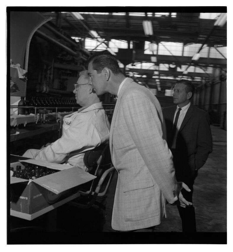 Negative, sheet film. 2 x 2 b&w. No. 725. OB Corp TV. Actor Colin Male tours Olympia brewery. No ID on others.