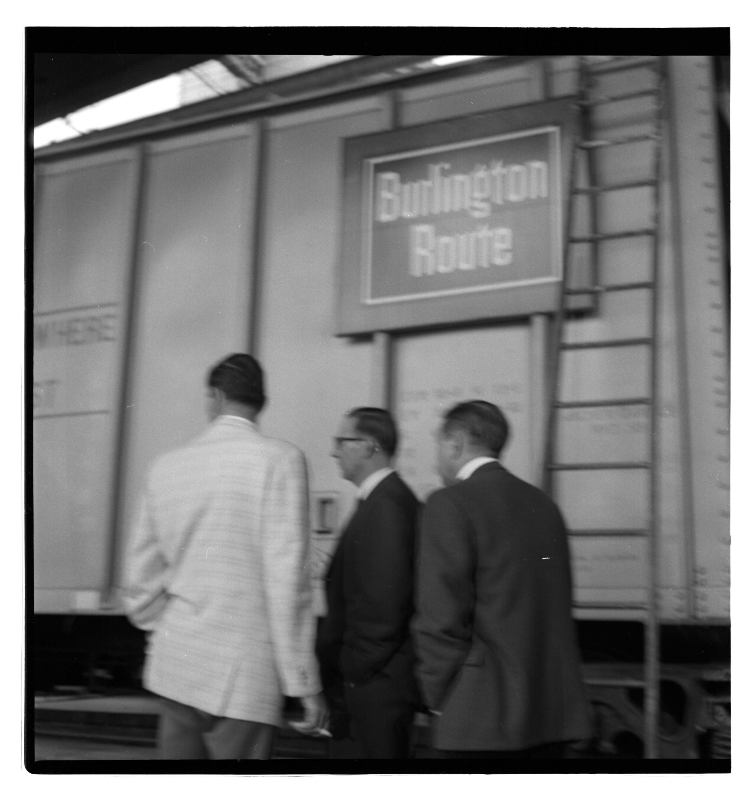 Negative, sheet film. 2 x 2 b&w. No. 725. OB Corp TV. Actor Colin Male tours Olympia brewery. Bobby Schmidt in center. No ID on other