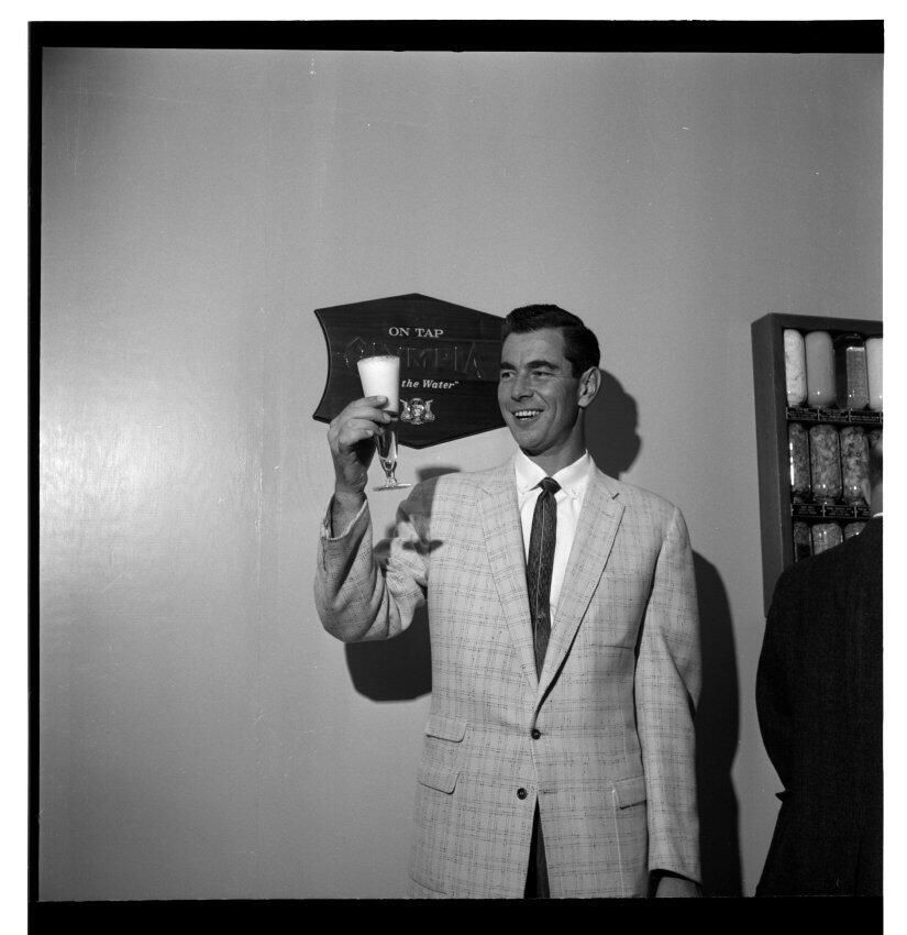Negative, sheet film. 2 x 2 b&w. No. 725. OB Corp TV. Actor Colin Male tours Olympia brewery.