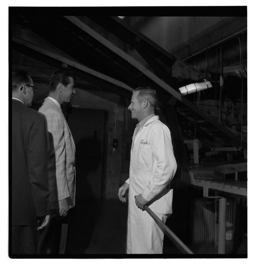 Negative, sheet film. 2 x 2 b&w. No. 725. OB Corp TV. Actor Colin Male tours Olympia brewery. Bobby Schmidt at left. No ID on other