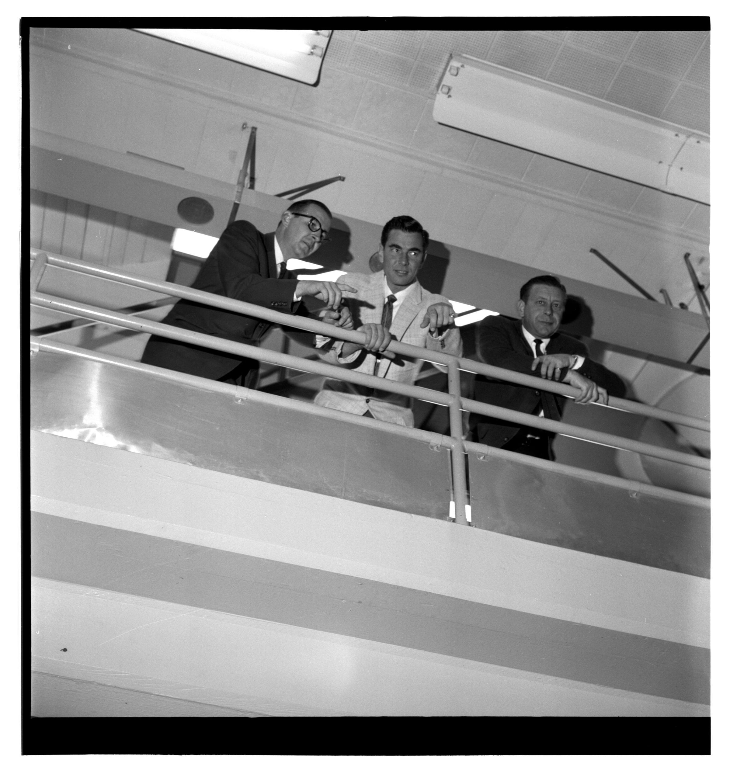 Negative, sheet film. 2 x 2 b&w. No. 725. OB Corp TV. Actor Colin Male tours Olympia brewery. Bobby Schmidt at left. No ID on other