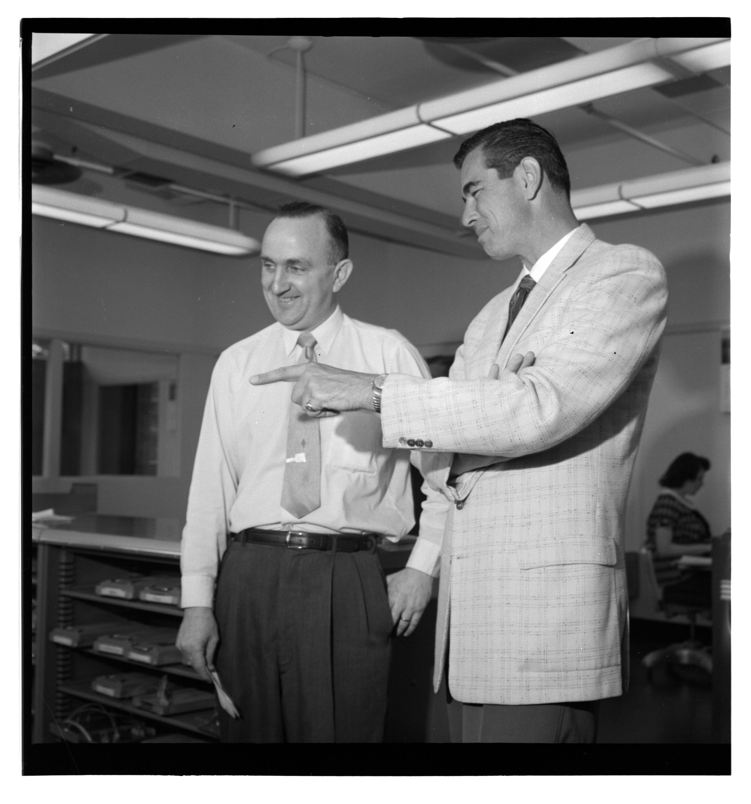 Negative, sheet film. 2 x 2 b&w. No. 725. OB Corp TV. Actor Colin Male tours Olympia brewery. No ID on other
