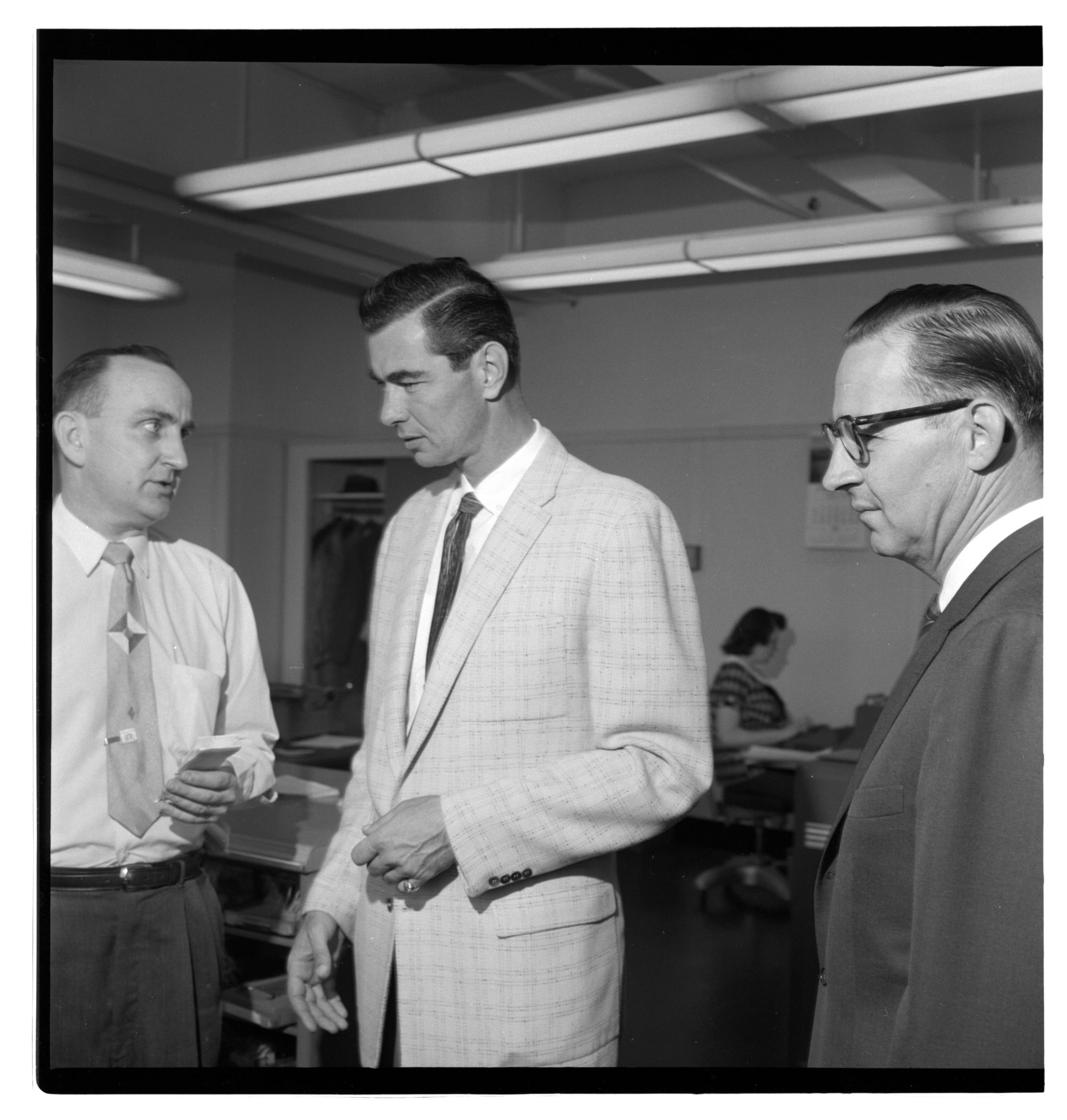 Negative, sheet film. 2 x 2 b&w. No. 725. OB Corp TV. Actor Colin Male tours Olympia brewery. Bobby Schmidt at right. No ID on other