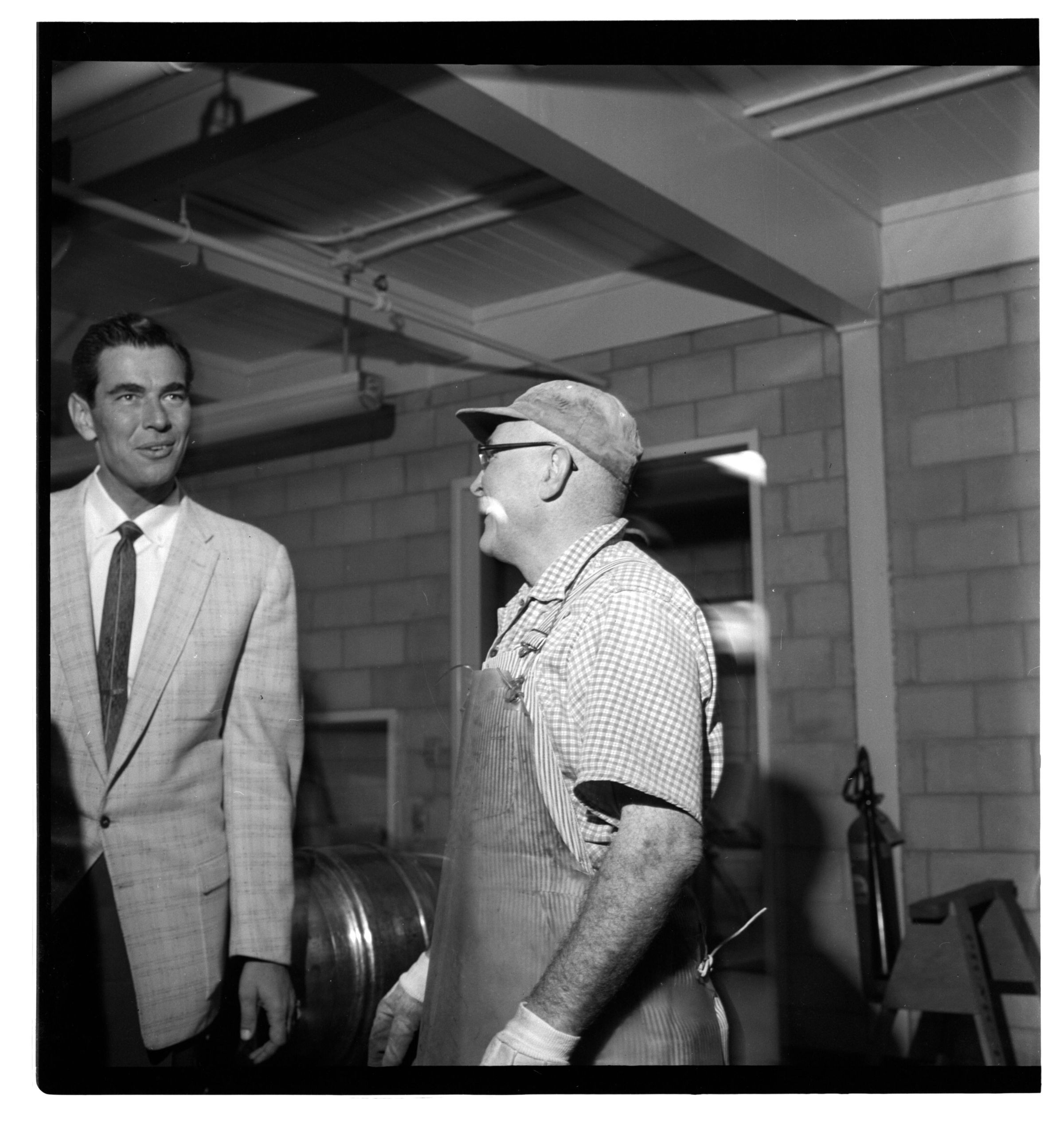 Negative, sheet film. 2 x 2 b&w. No. 725. OB Corp TV. Actor Colin Male tours Olympia brewery. No ID on other