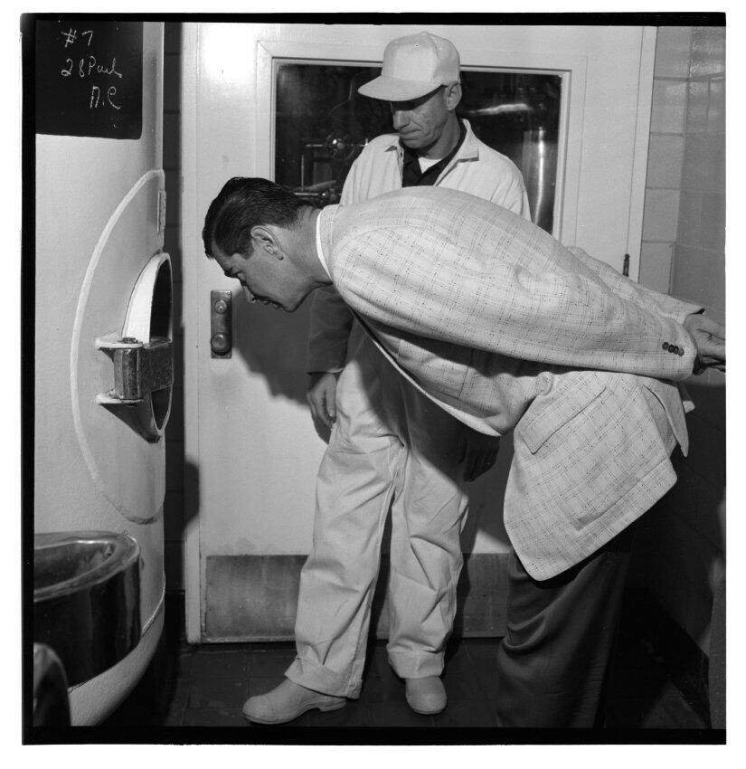 Negative, sheet film. 2 x 2 b&w. No. 725. OB Corp TV. Actor Colin Male tours Olympia brewery. No ID on other