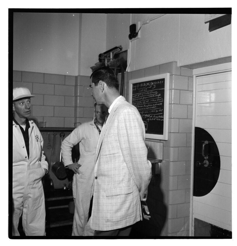 Negative, sheet film. 2 x 2 b&w. No. 725. OB Corp TV. Actor Colin Male tours Olympia brewery. No ID on others