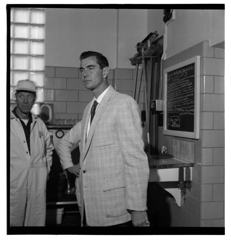 Negative, sheet film. 2 x 2 b&w. No. 725. OB Corp TV. Actor Colin Male tours Olympia brewery. No ID on others