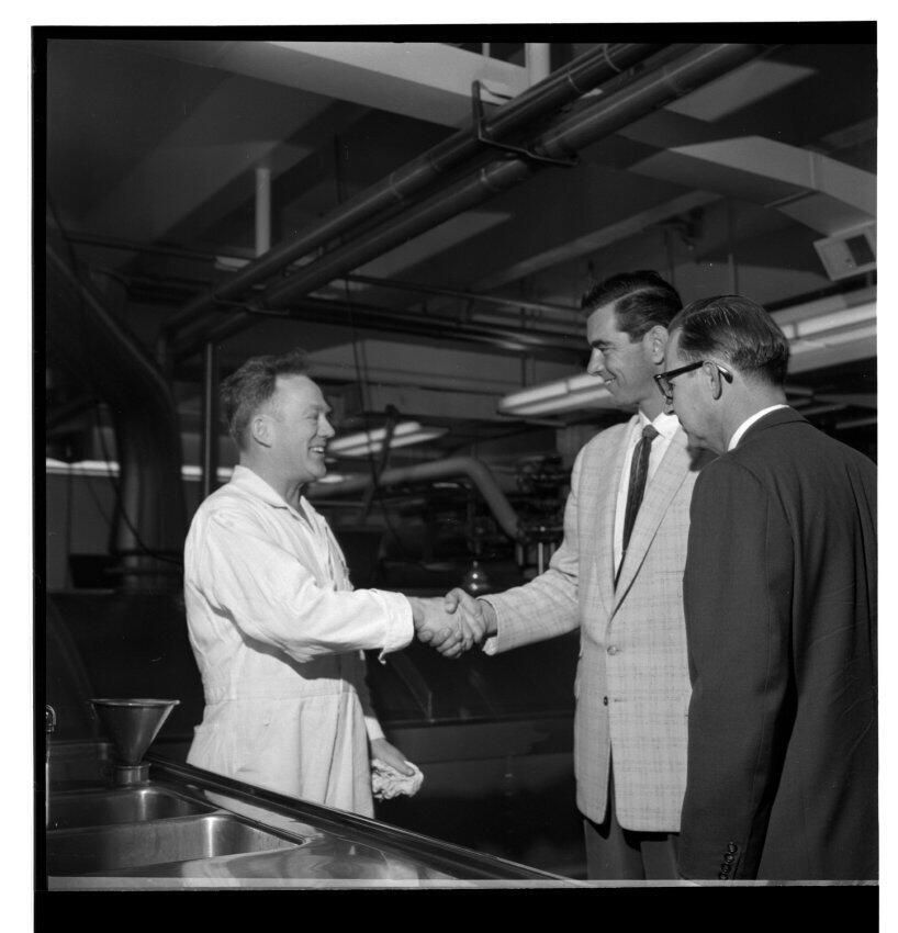 Negative, sheet film. 2 x 2 b&w. No. 725. OB Corp TV. Actor Colin Male tours Olympia brewery. Bobby Schmidt at right. No ID on other