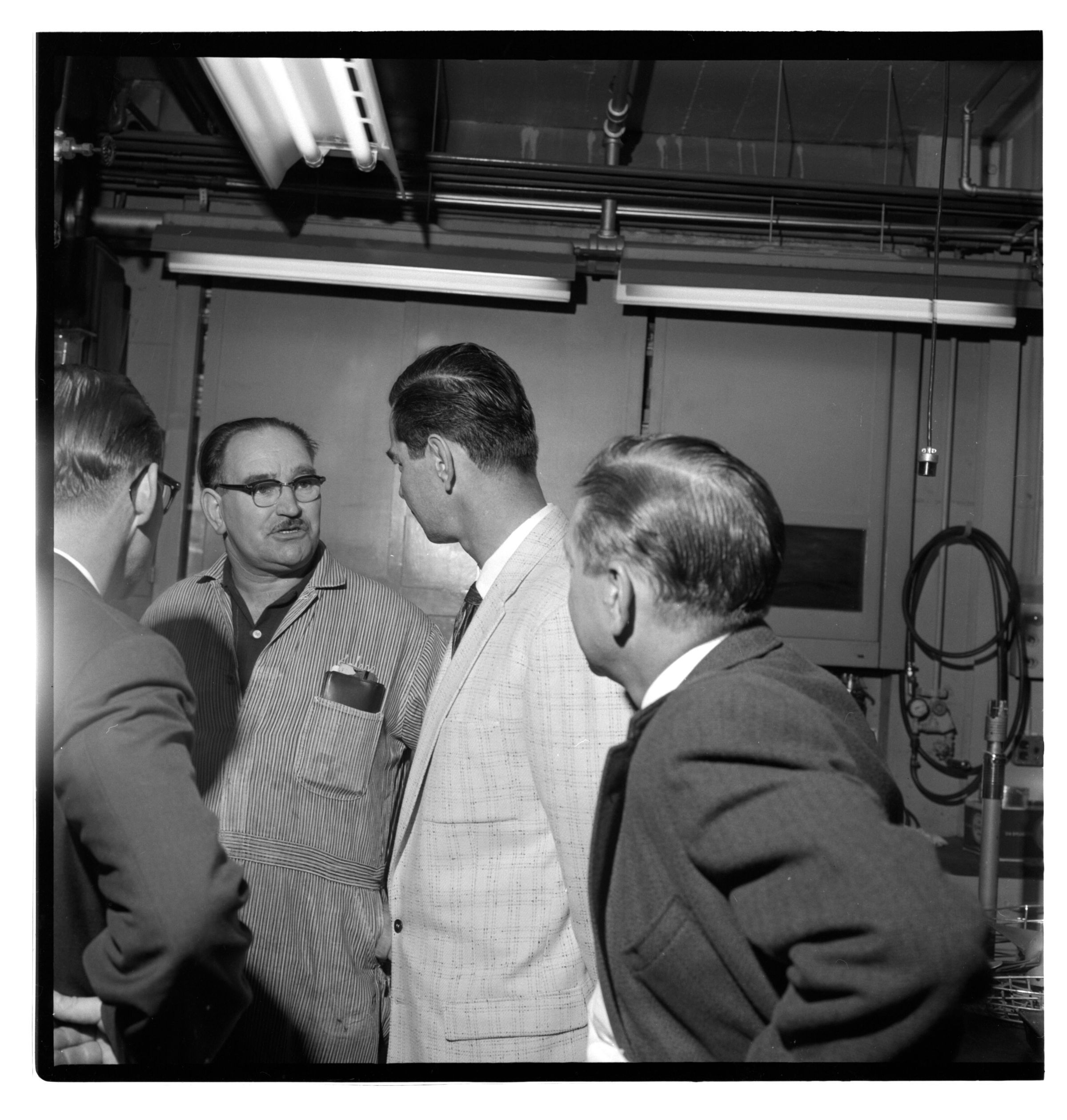 Negative, sheet film. 2 x 2 b&w. No. 725. OB Corp TV. Actor Colin Male tours Olympia brewery. Bobby Schmidt at left. No ID on others