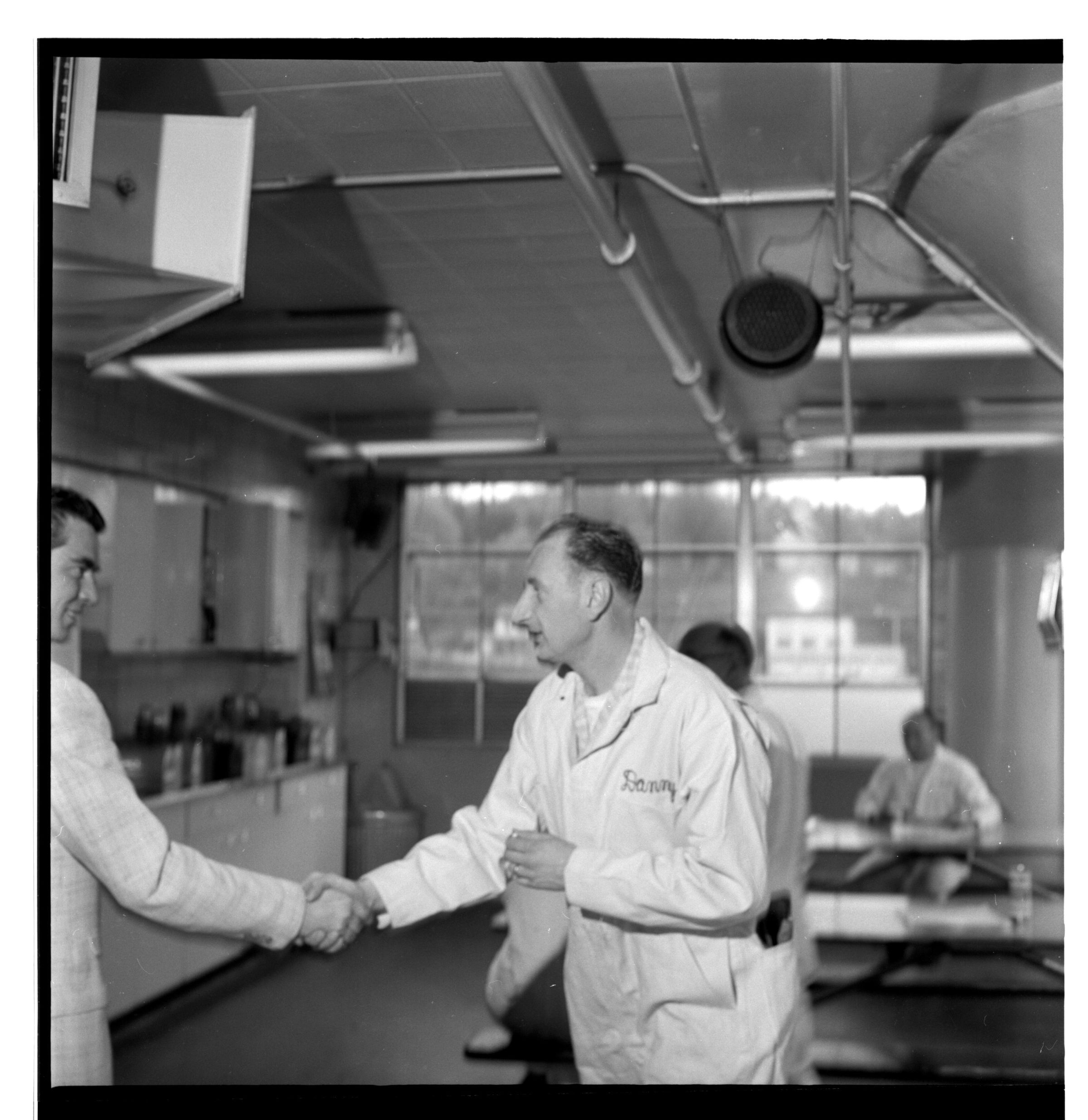 Negative, sheet film. 2 x 2 b&w. No. 725. OB Corp TV. Actor Colin Male tours Olympia brewery. No ID on others