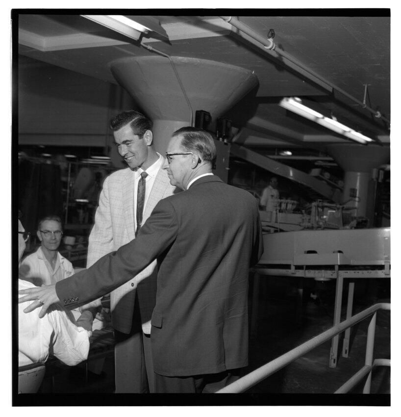 Negative, sheet film. 2 x 2 b&w. No. 725. OB Corp TV. Actor Colin Male tours Olympia brewery. Bobby Schmidt at right. No ID on others