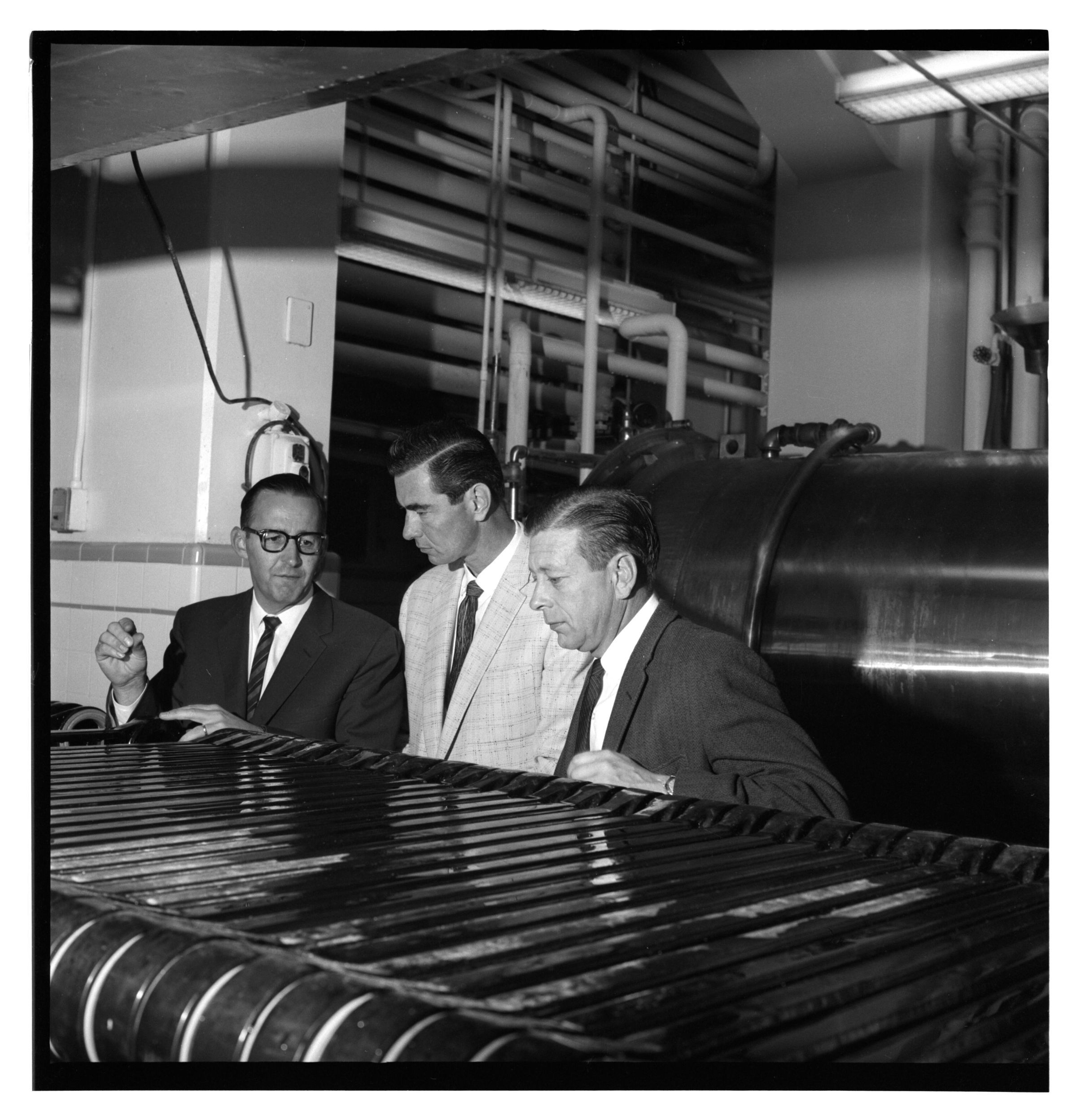 Negative, sheet film. 2 x 2 b&w. No. 725. OB Corp TV. Actor Colin Male tours Olympia brewery. Bobby Schmidt at left. No ID on other