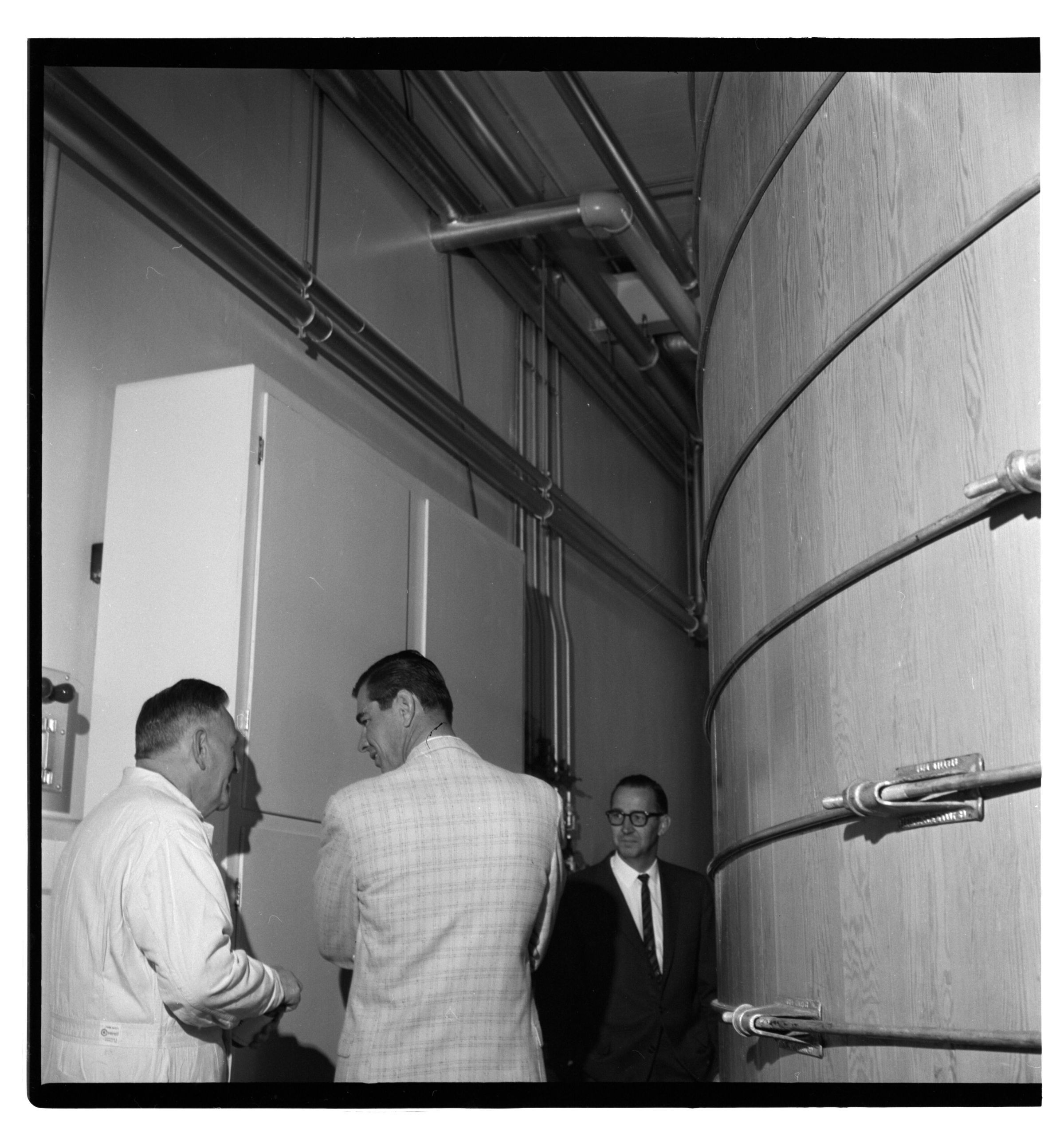 Negative, sheet film. 2 x 2 b&w. No. 725. OB Corp TV. Actor Colin Male tours Olympia brewery. Bobby Schmidt at right. No ID on other