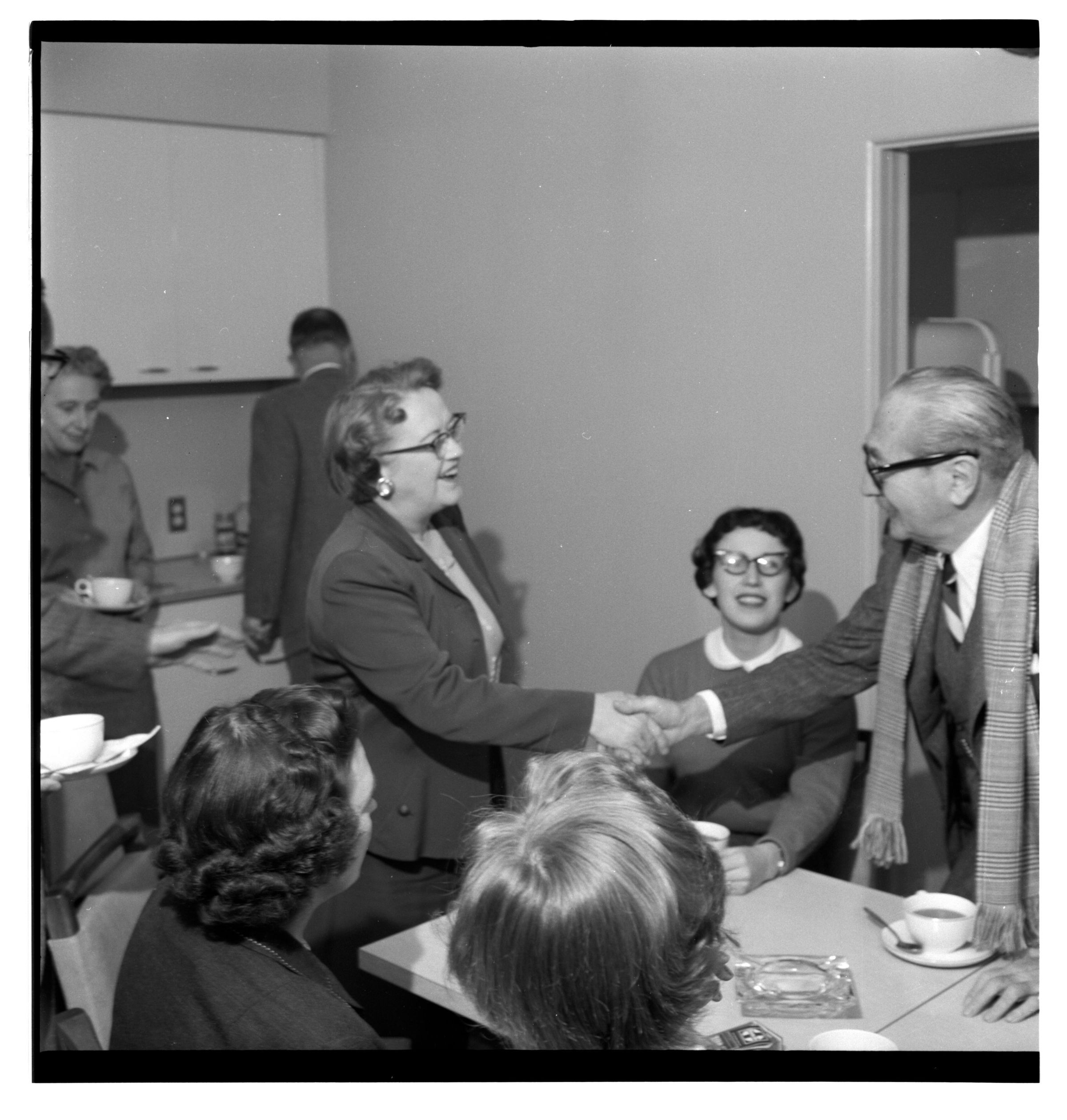 Negative, sheet film. 2 x 2 b&w. No. 524. OB Corp TV. Actor Adolphe Menjou tours Olympia brewery. No ID on others