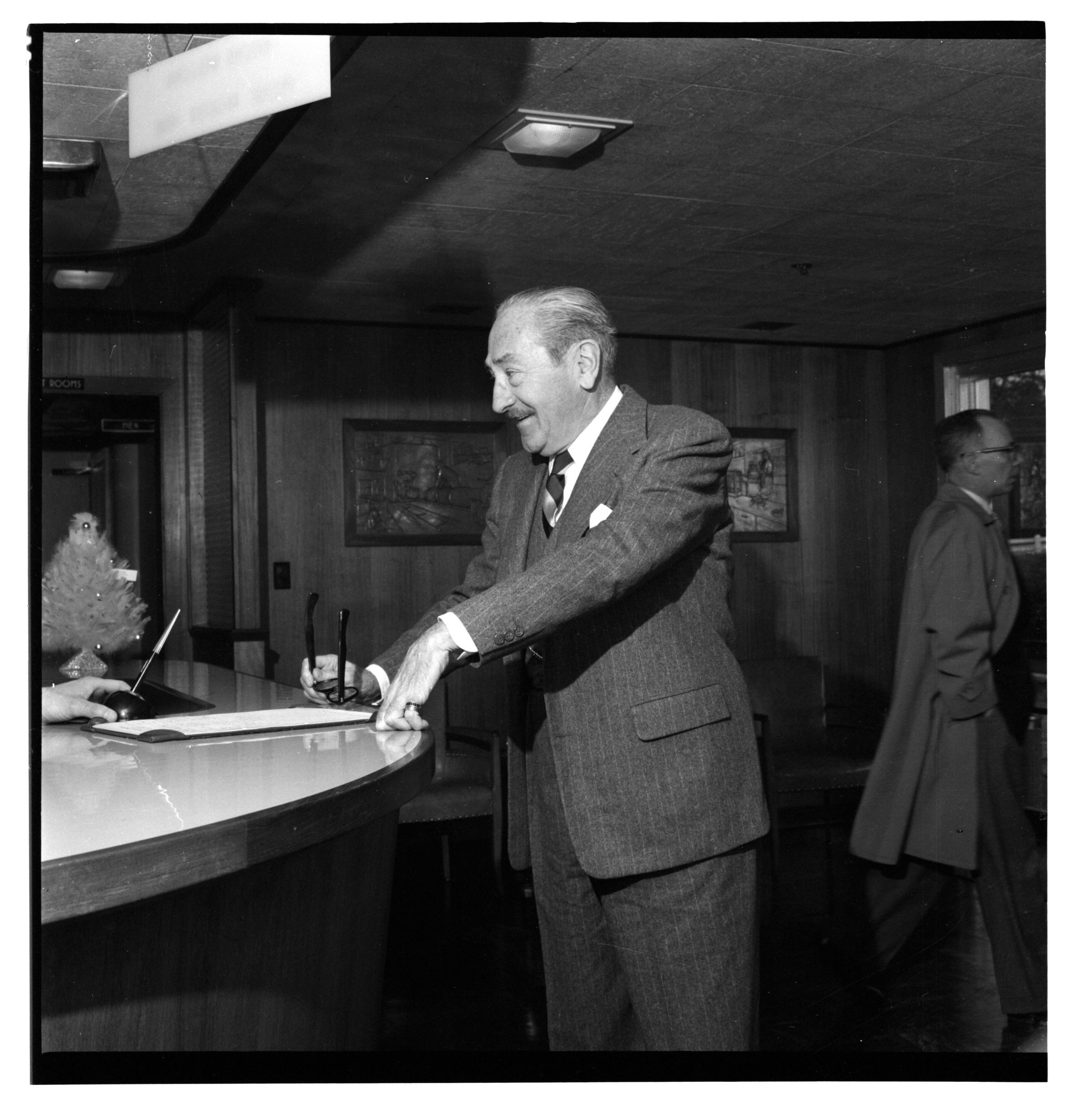 Negative, sheet film. 2 x 2 b&w. No. 524. OB Corp TV. Actor Adolphe Menjou tours Olympia brewery. No ID on other