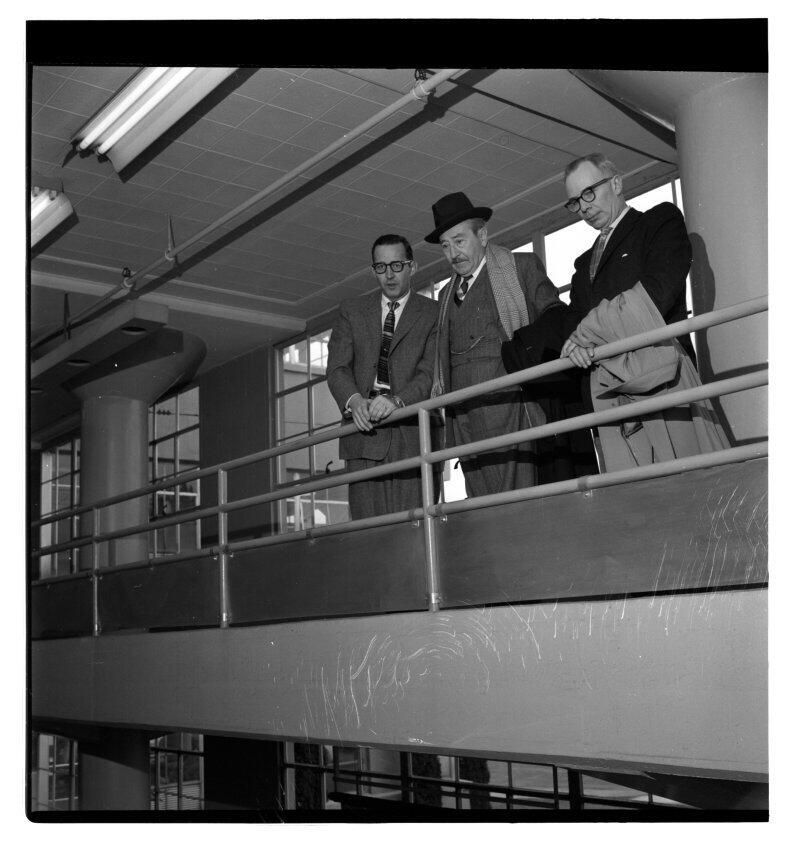 Negative, sheet film. 2 x 2 b&w. No. 524. OB Corp TV. Actor Adolphe Menjou tours Olympia brewery. Bobby Schmidt at left. No ID on other