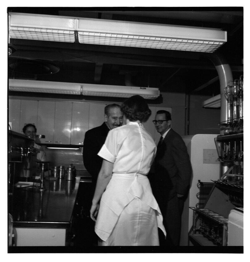 Negative, sheet film. 2 x 2 b&w. No. 524. OB Corp TV. Actor Adolphe Menjou tours Olympia brewery. Bobby Schmidt at right. No ID on other