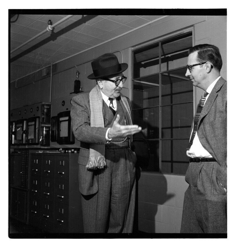 Negative, sheet film. 2 x 2 b&w. No. 524. OB Corp TV. Actor Adolphe Menjou tours Olympia brewery. Bobby Schmidt at right.