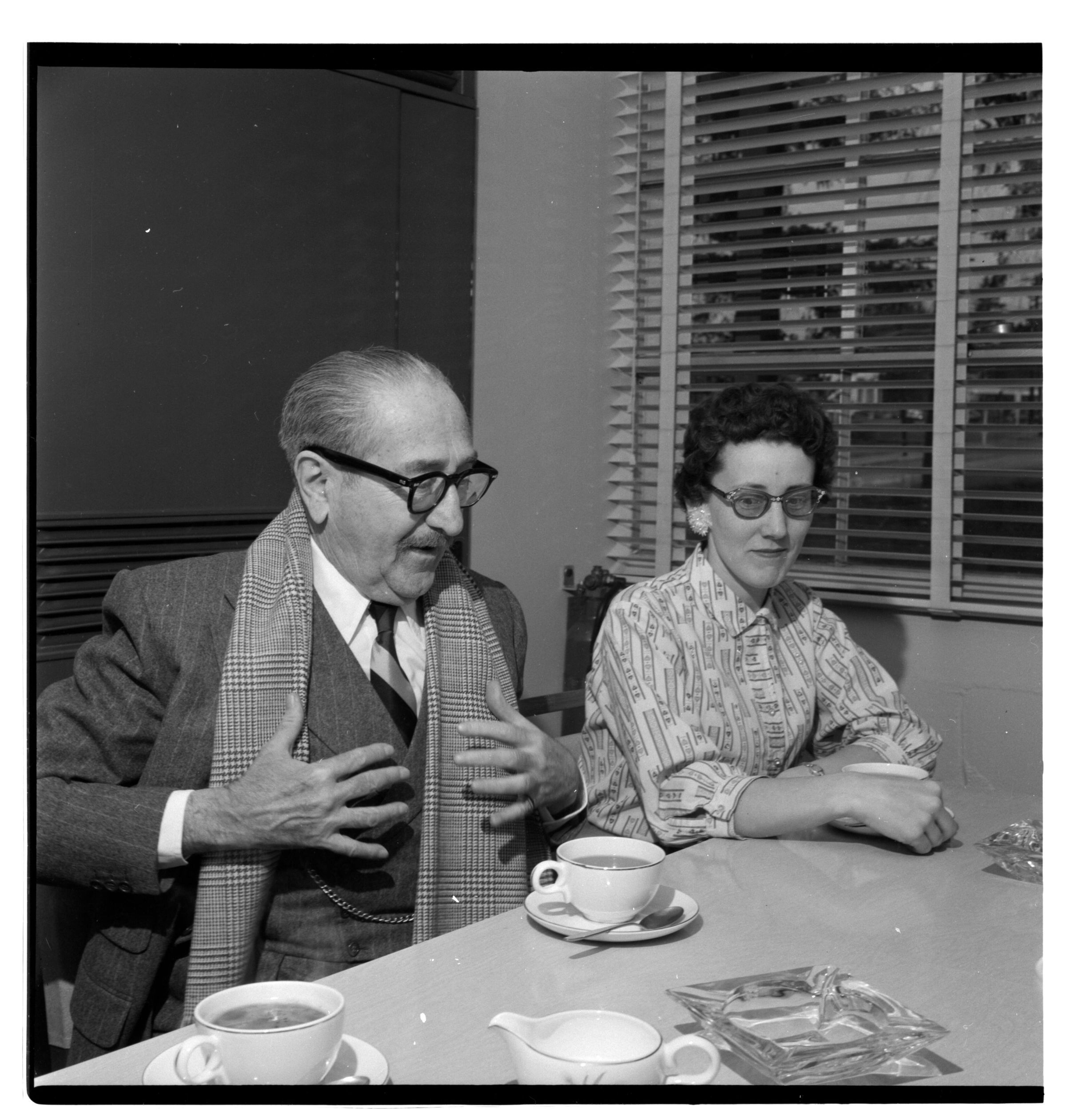 Negative, sheet film. 2 x 2 b&w. No. 524. OB Corp TV. Actor Adolphe Menjou tours Olympia brewery. No ID on other