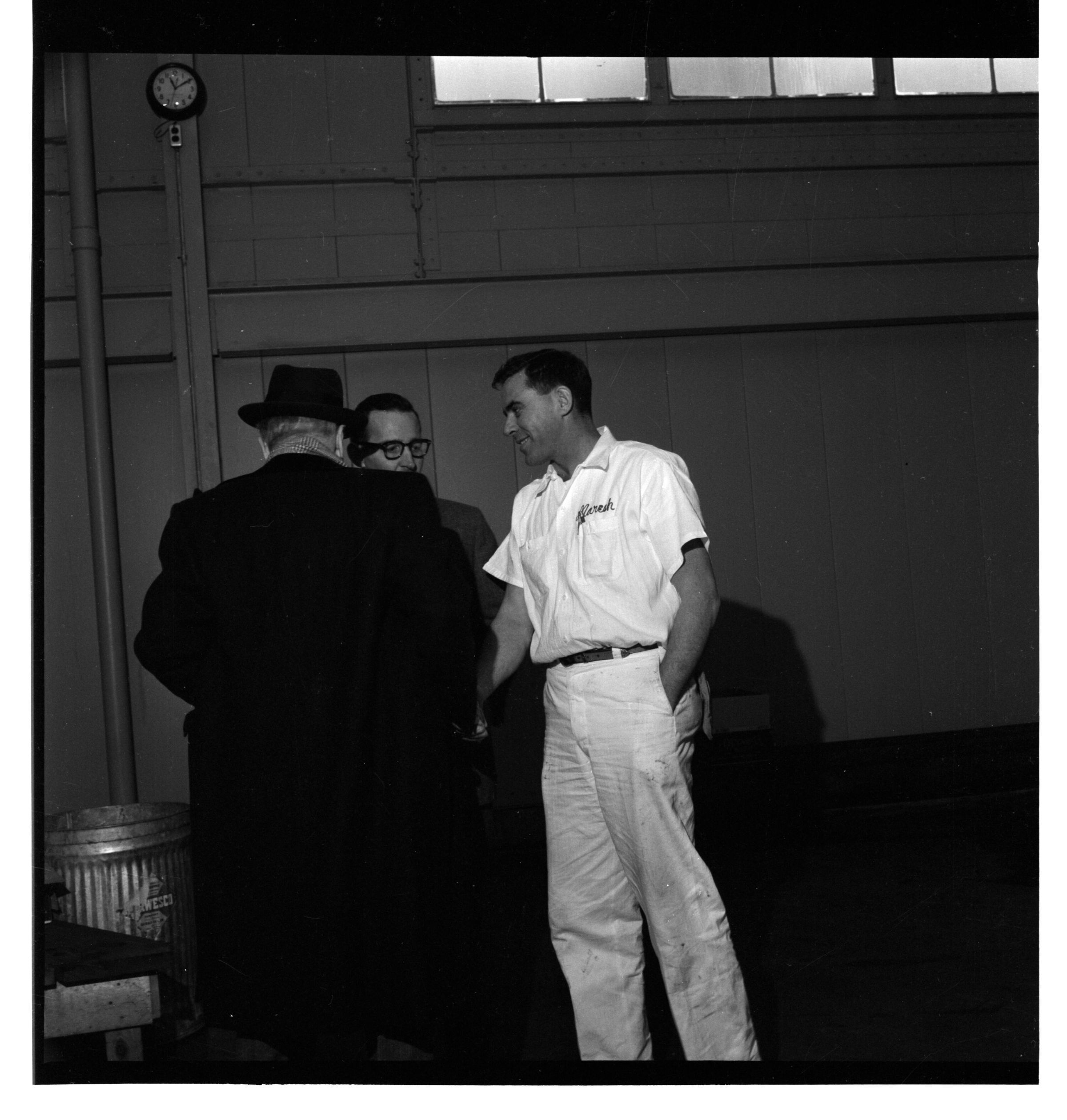 Negative, sheet film. 2 x 2 b&w. No. 524. OB Corp TV. Actor Adolphe Menjou tours Olympia brewery. Bobby Schmidt in center. No ID on other