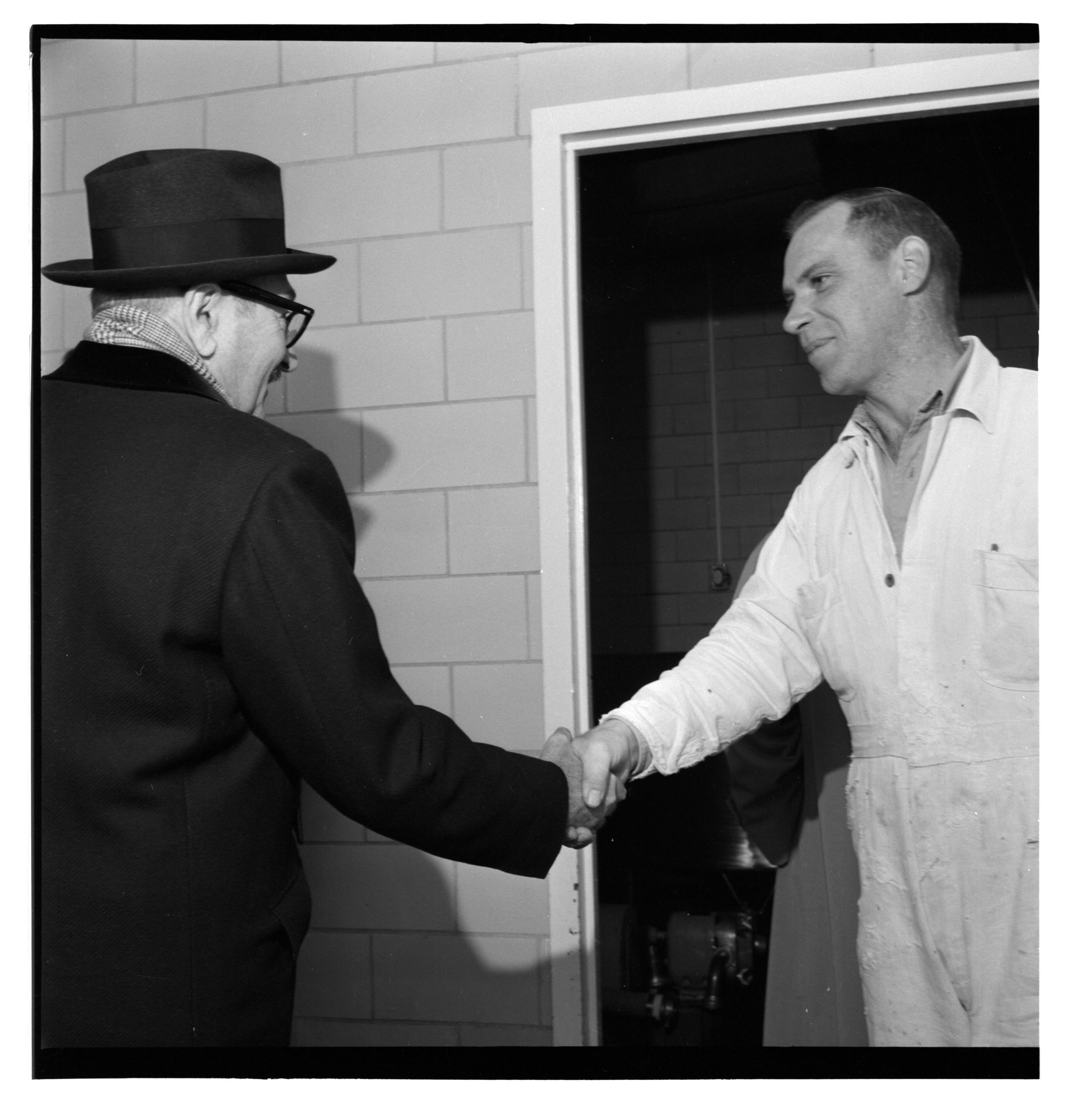 Negative, sheet film. 2 x 2 b&w. No. 524. OB Corp TV. Actor Adolphe Menjou tours Olympia brewery. No ID on other