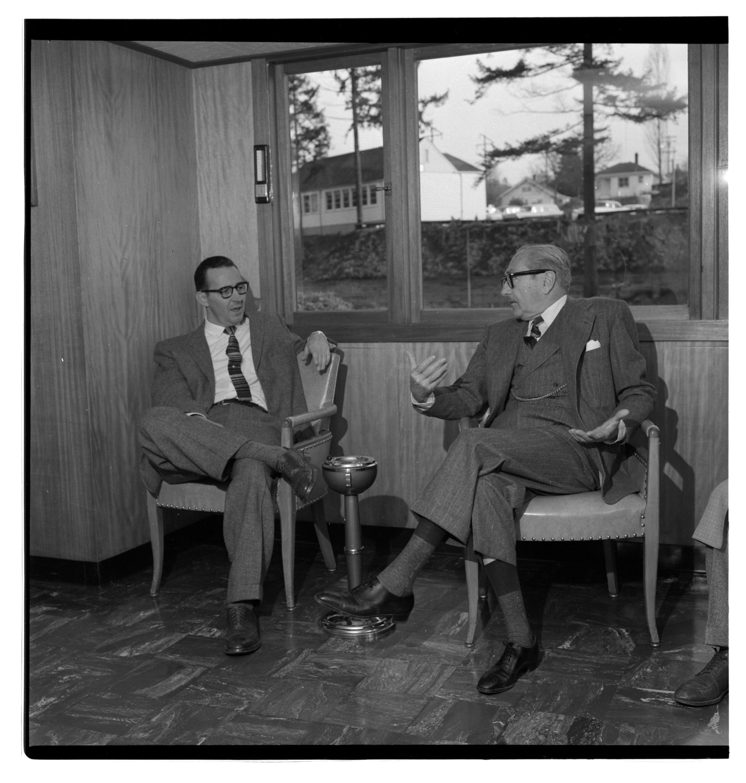 Negative, sheet film. 2 x 2 b&w. No. 524. OB Corp TV. Actor Adolphe Menjou tours Olympia brewery. Bobby Schmidt at left