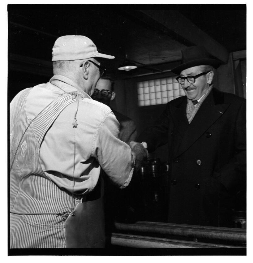 Negative, sheet film. 2 x 2 b&w. No. 524. OB Corp TV. Actor Adolphe Menjou tours Olympia brewery. Bobby Schmidt in center. No ID on other