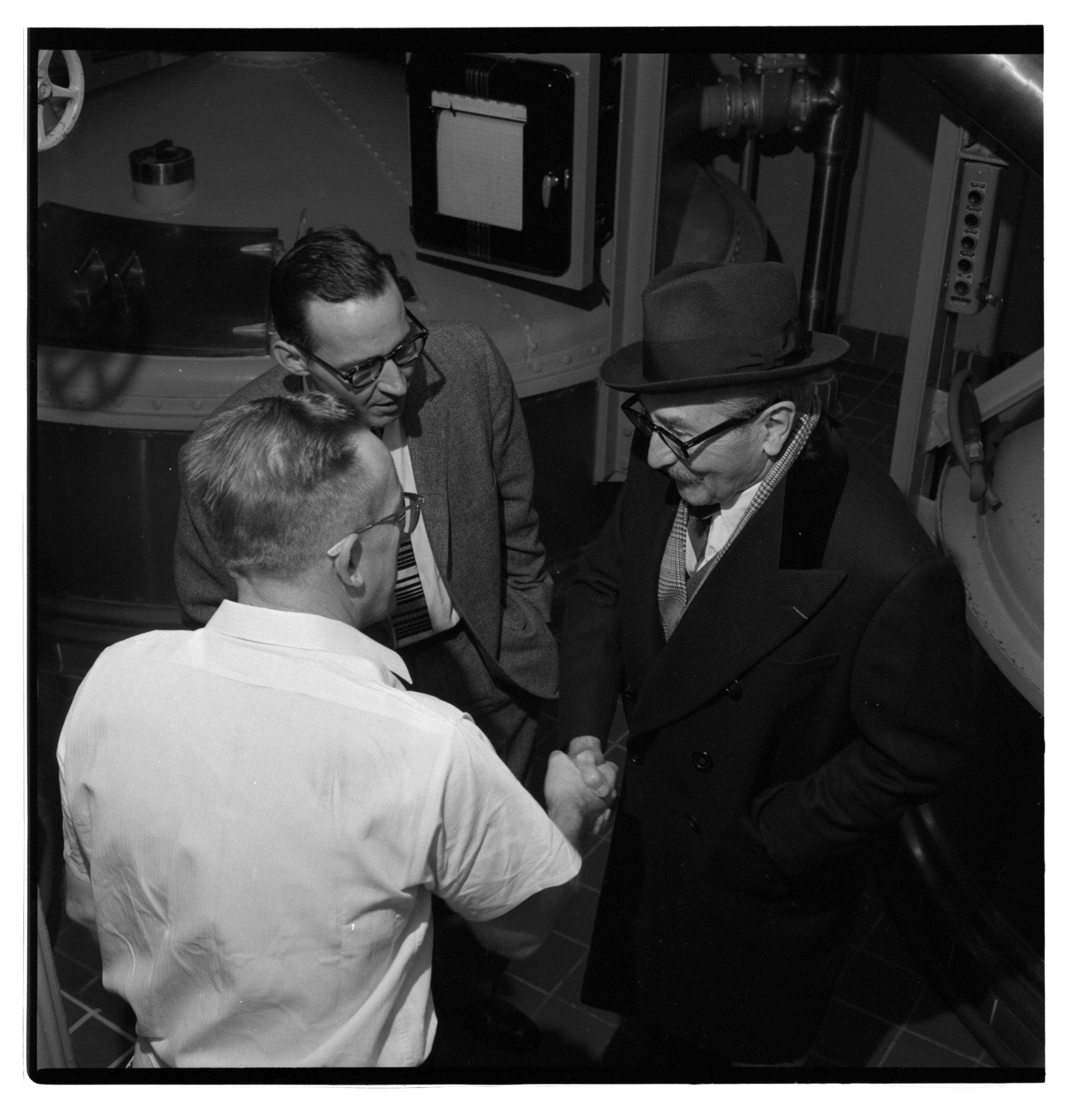 Negative, sheet film. 2 x 2 b&w. No. 524. OB Corp TV. Actor Adolphe Menjou tours Olympia brewery. Bobby Schmidt in center. No ID on other