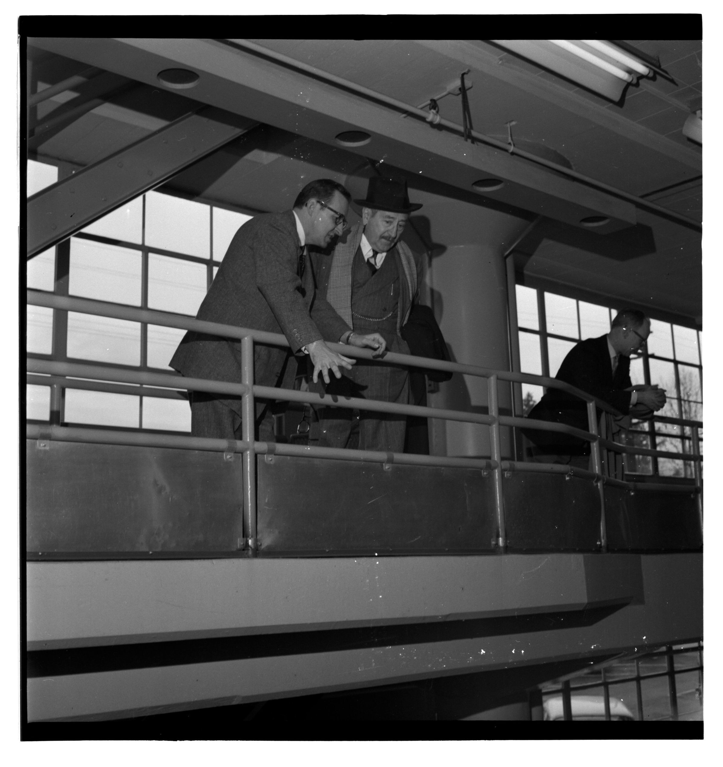 Negative, sheet film. 2 x 2 b&w. No. 524. OB Corp TV. Actor Adolphe Menjou tours Olympia brewery. Bobby Schmidt at left. No ID on others
