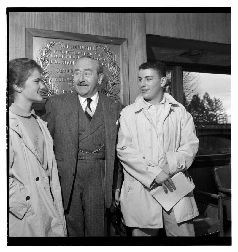 Negative, sheet film. 2 x 2 b&w. No. 524. OB Corp TV. Actor Adolphe Menjou tours Olympia brewery. No ID on others