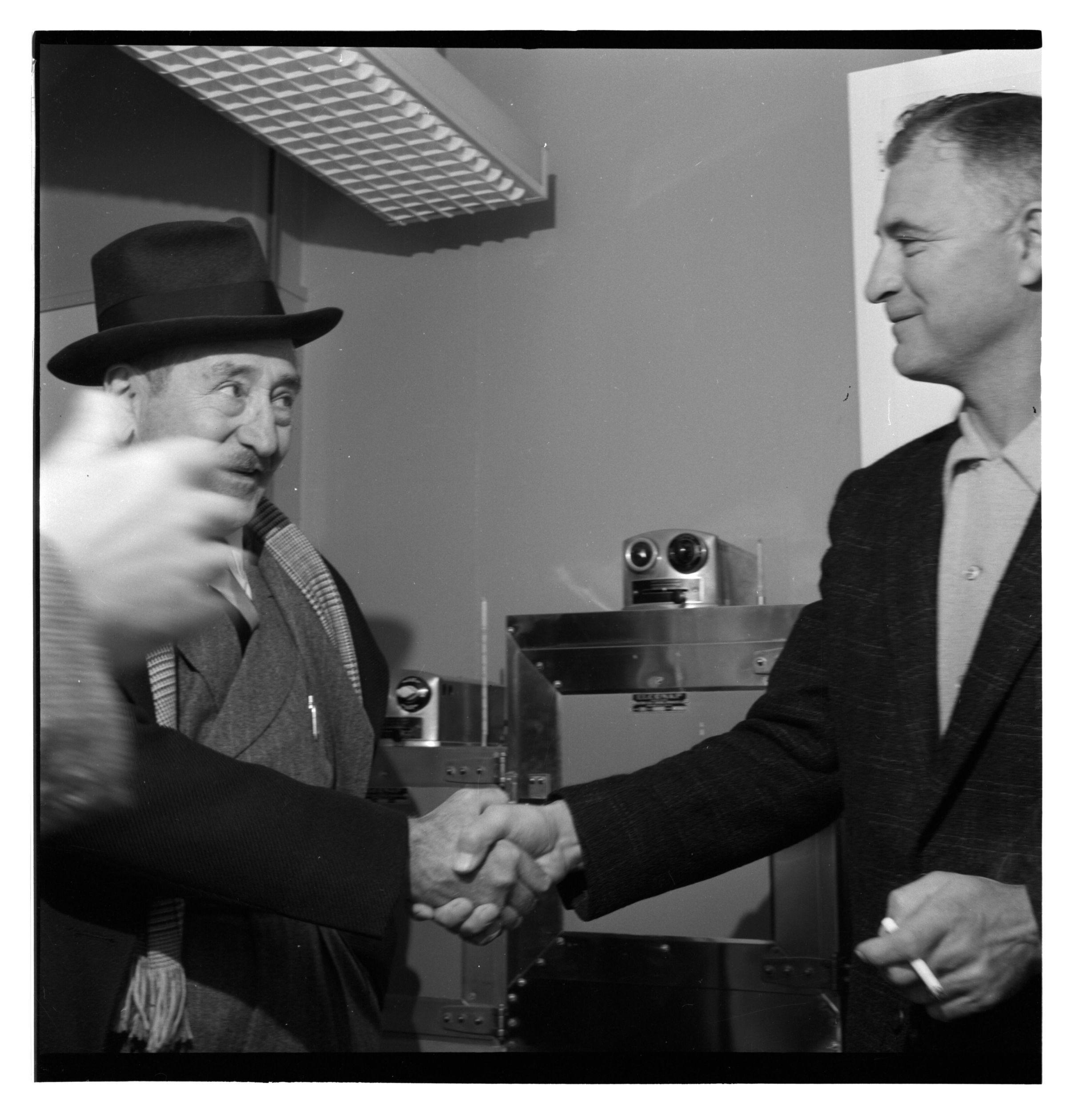 Negative, sheet film. 2 x 2 b&w. No. 524. OB Corp TV. Actor Adolphe Menjou tours Olympia brewery. No ID on other