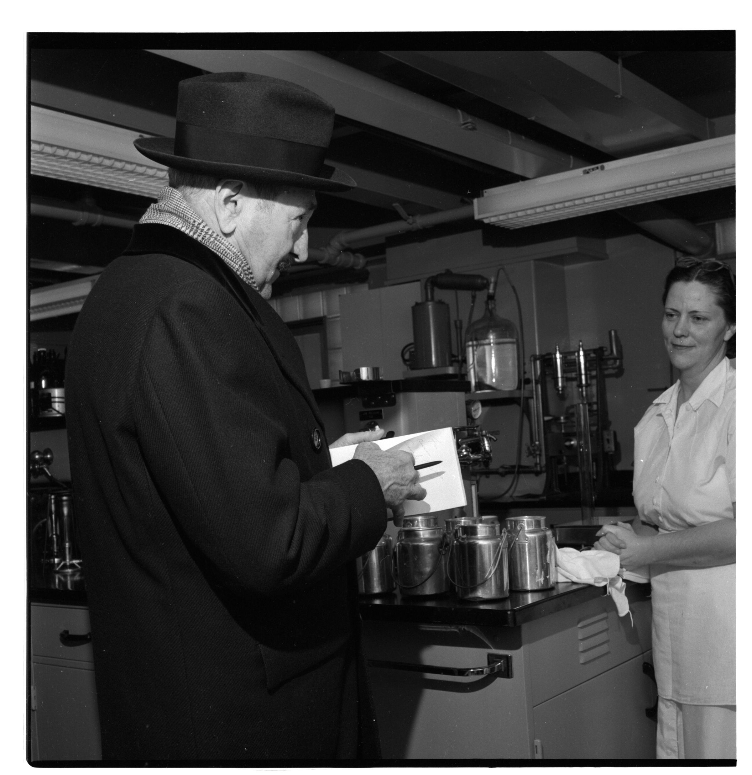 Negative, sheet film. 2 x 2 b&w. No. 524. OB Corp TV. Actor Adolphe Menjou tours Olympia brewery. No ID on other