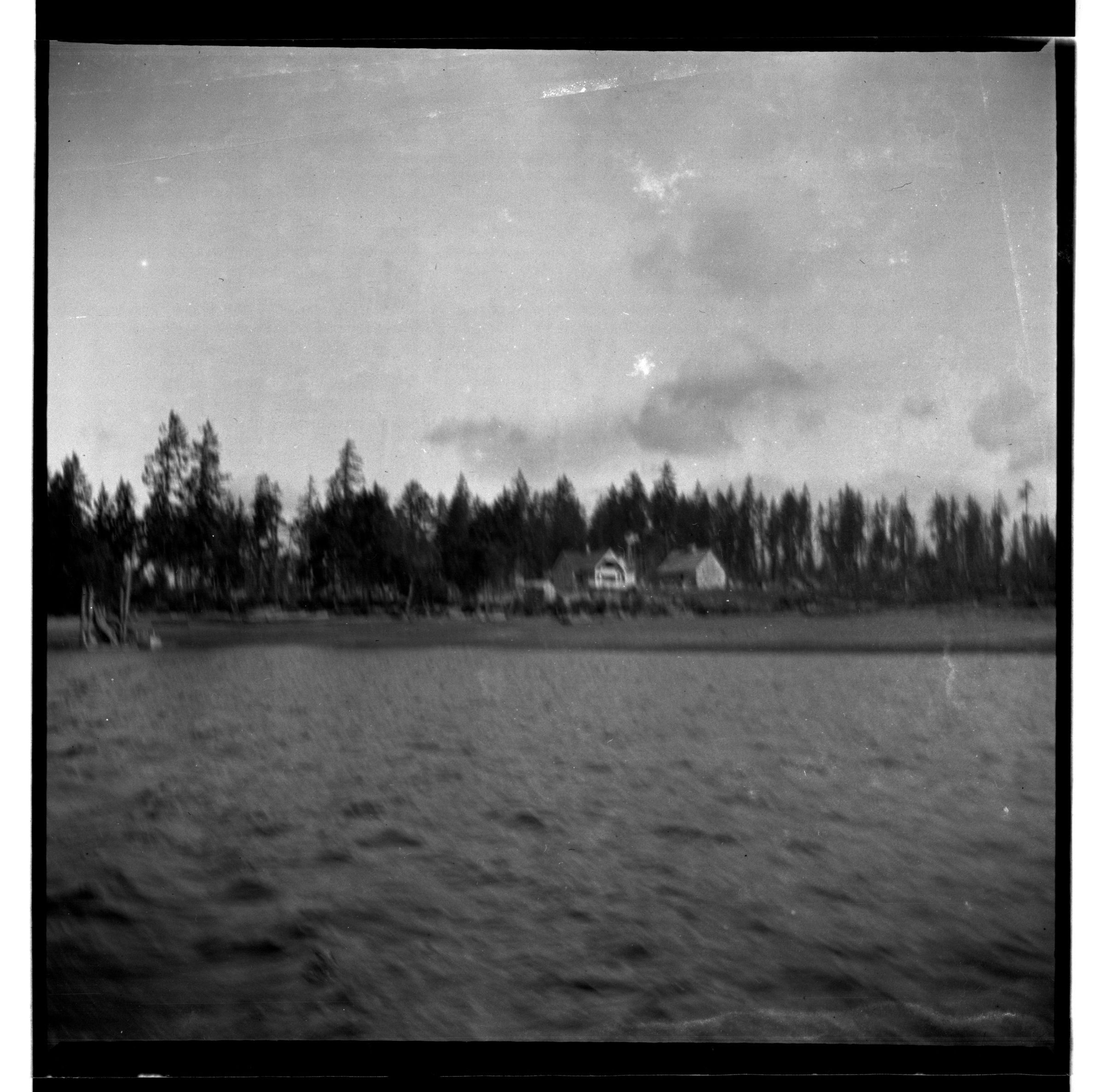 Negative, sheet film. 3 x 3 b&w. May be Louis Schmidt's house on Hope Island.