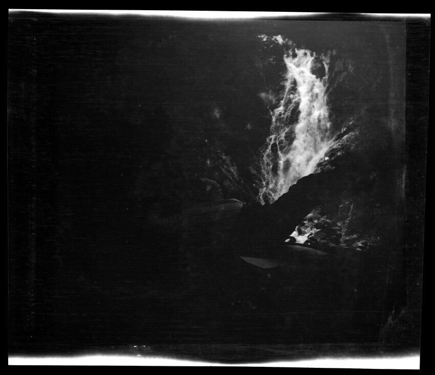 Negative, sheet film. 3 x 3 b&w. Unidentified waterfall.
