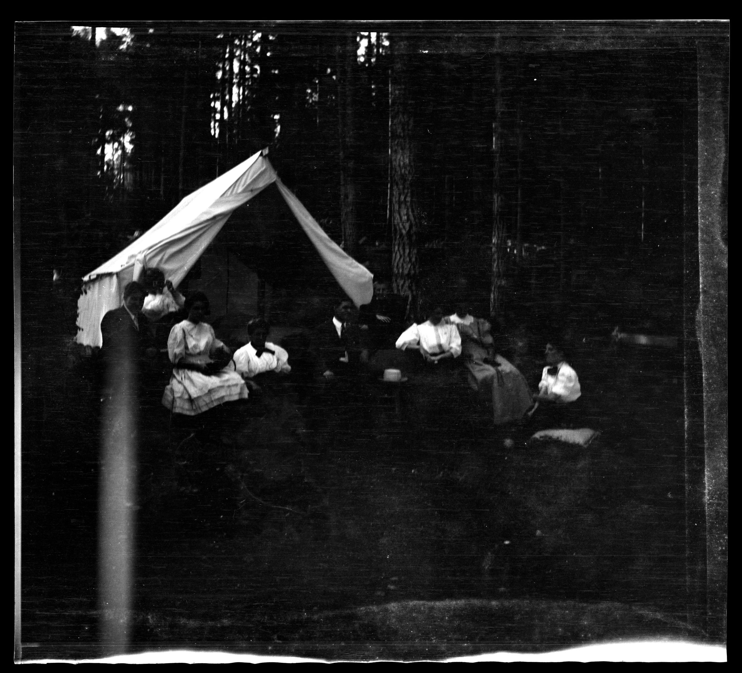Negative, sheet film. 3 x 3 b&w. Tent in forest. No ID on people.