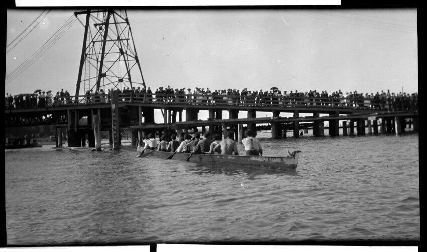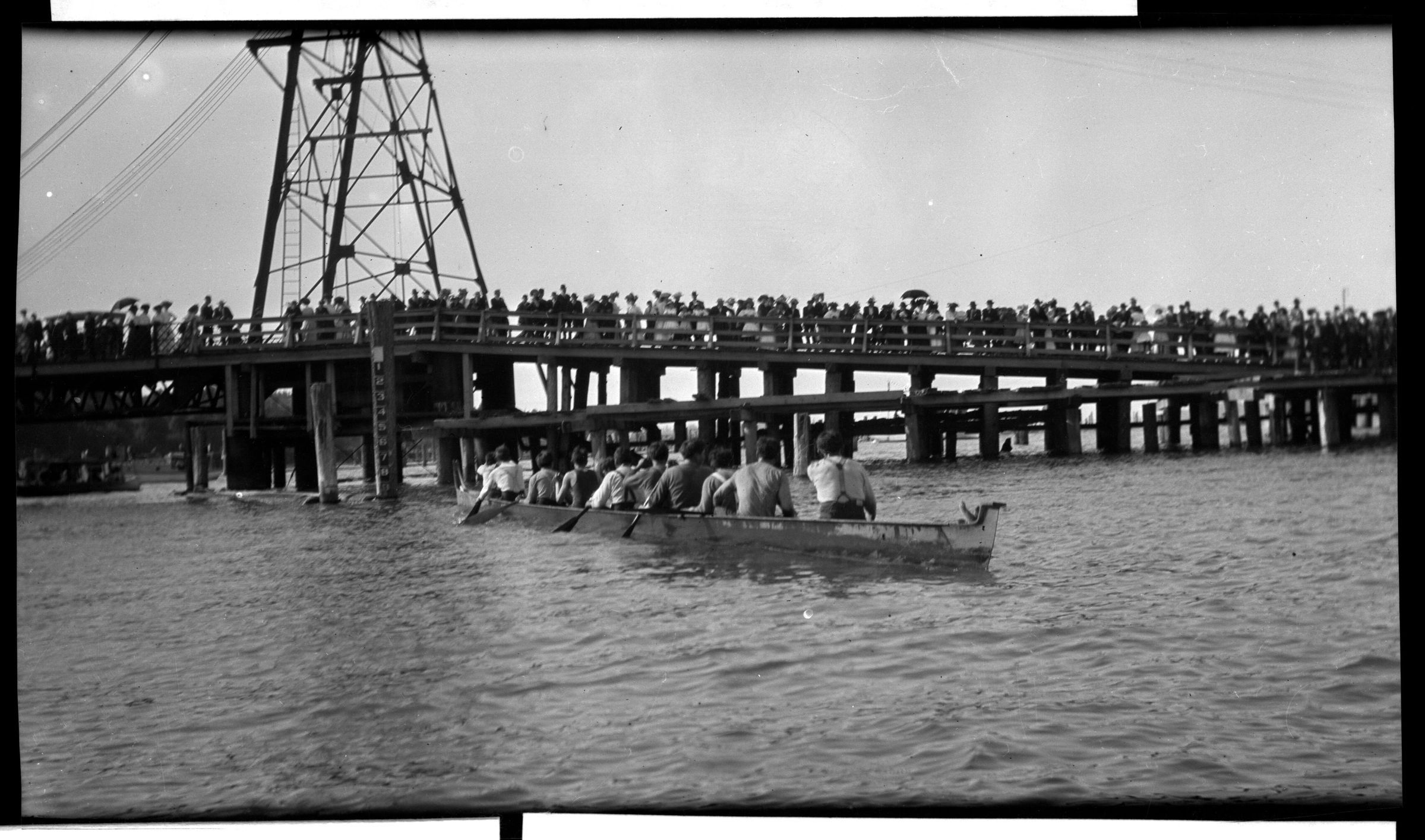 Negative, sheet film. 3 x 5 b&w. Men paddling large Native American-style dugout canoe. WSHS has photos from same series and describes event: "Photograph of two long canoes racing in the Deschutes Estuary, Olympia, WA, Thurston County, on July 4, 1905. According to accompanying narrative, we are looking toward downtown Olympia from the Fourth Avenue Bridge. Two canoes are racing, each one with eleven paddlers. A small steamer is observing the race. In the distance we can see the wooded Capitol Hill and the railroad bridge across the Deschutes Estuary. We can just make out the old Territorial Capitol hidden among the trees, St. Peter's Hospital, Providence Academy, and the steeple of First Congregational Church. A beach is along the bank, with pilings extending into the estuary." See WSHS photo C1949.1276.1... for similar photos.Name/Title