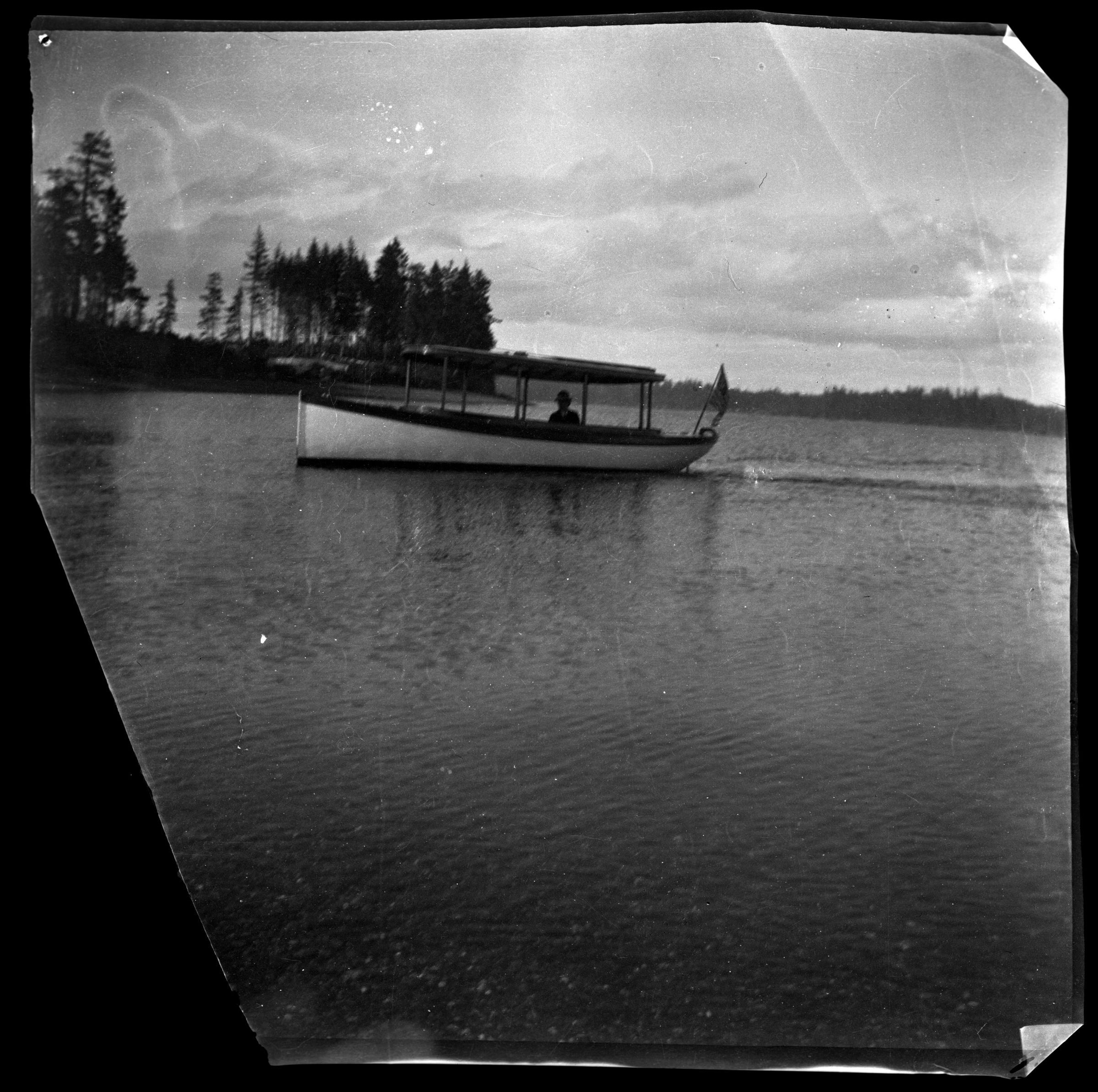 Negative, sheet film. 3 x 3 b&w. Motor launch "Montana" probably on southern Puget Sound. Man is probably Peter G. Schmidt Sr.