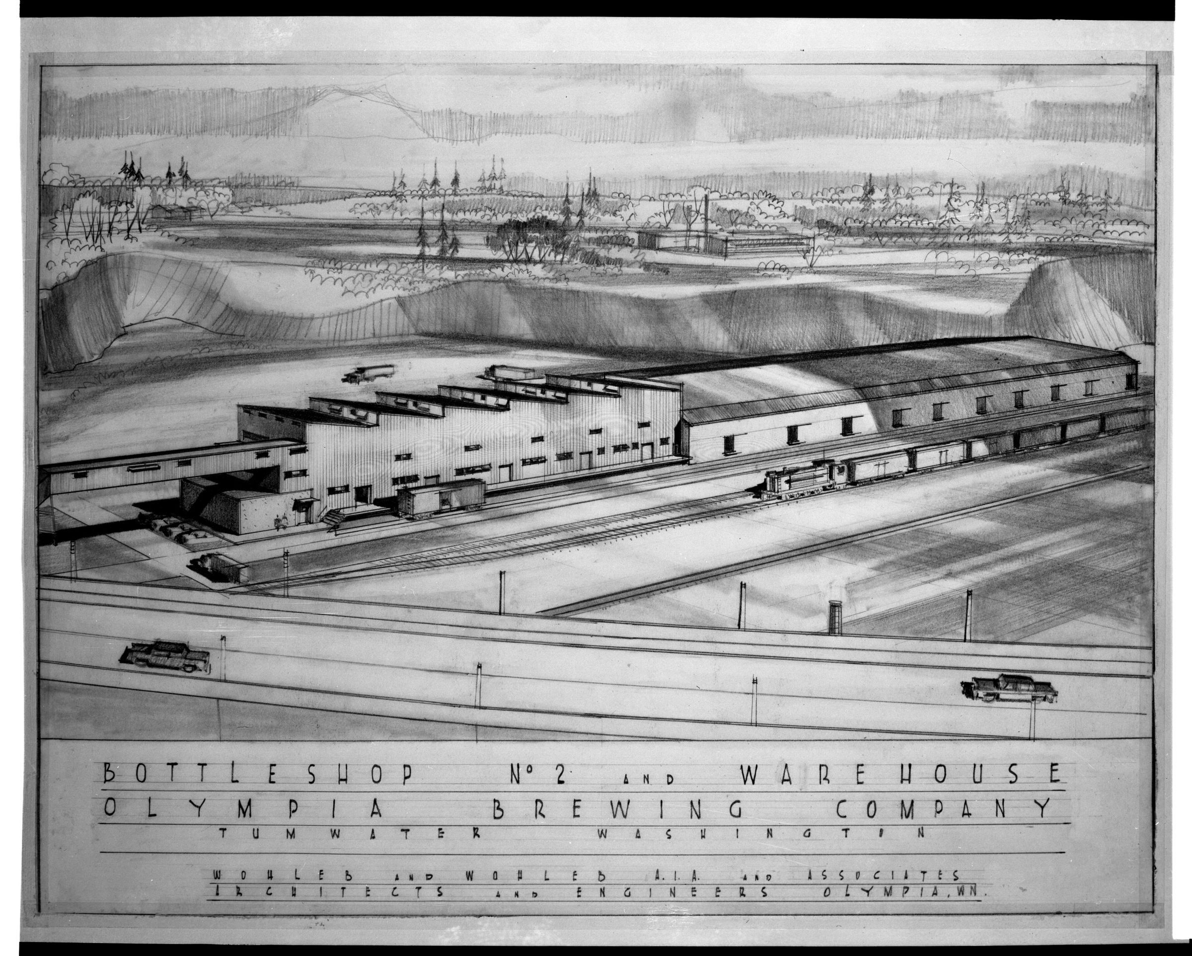 Negative, sheet film. 4 x 5 b&w. No. 98. Olympia brewery bottleshop No. 2 and warehouse drawing created by Wohleb and Wohleb Architects, Olympia WA.