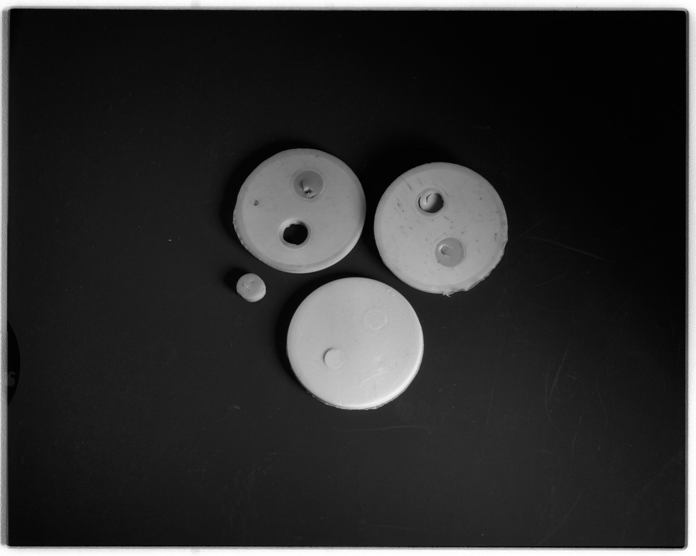 Negative, sheet film. 4 x 5 b&w. Diaphragm, part of keg tap device patented by Olympia Brewery.