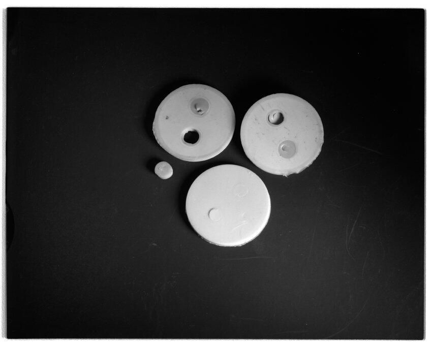 Negative, sheet film. 4 x 5 b&w. Diaphragm, part of keg tap device patented by Olympia Brewery.
